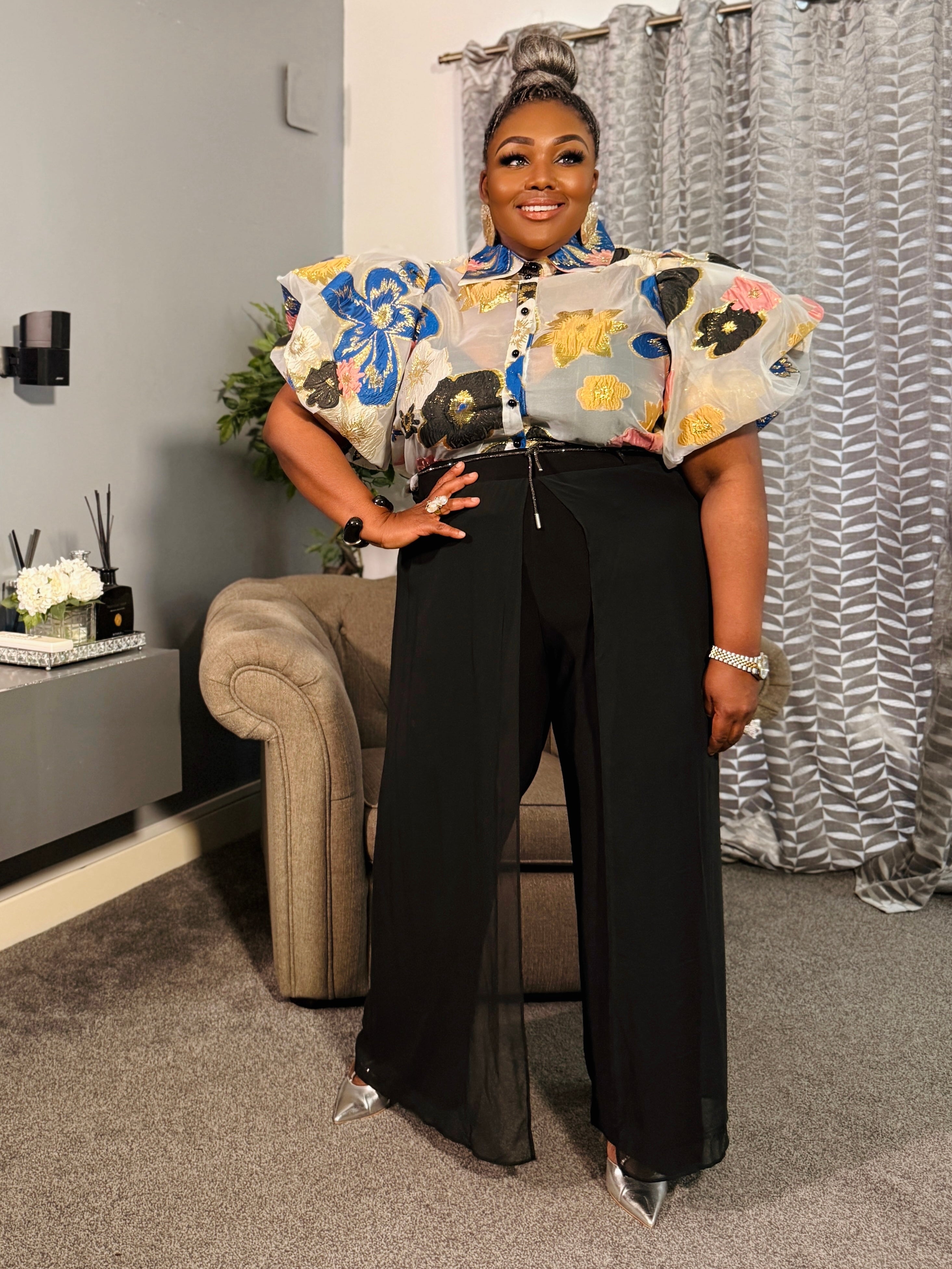 Turn heads in the Auriella Bloom Organza Shirt, a statement piece that blends elegance with bold artistry. Crafted from sheer organza, this top is adorned with oversized floral embroidery in striking metallic and jewel tones, making it a true wardrobe showstopper. The structured puff sleeves and crisp button-down collar add a touch of drama, while the breathable fabric ensures effortless sophistication.