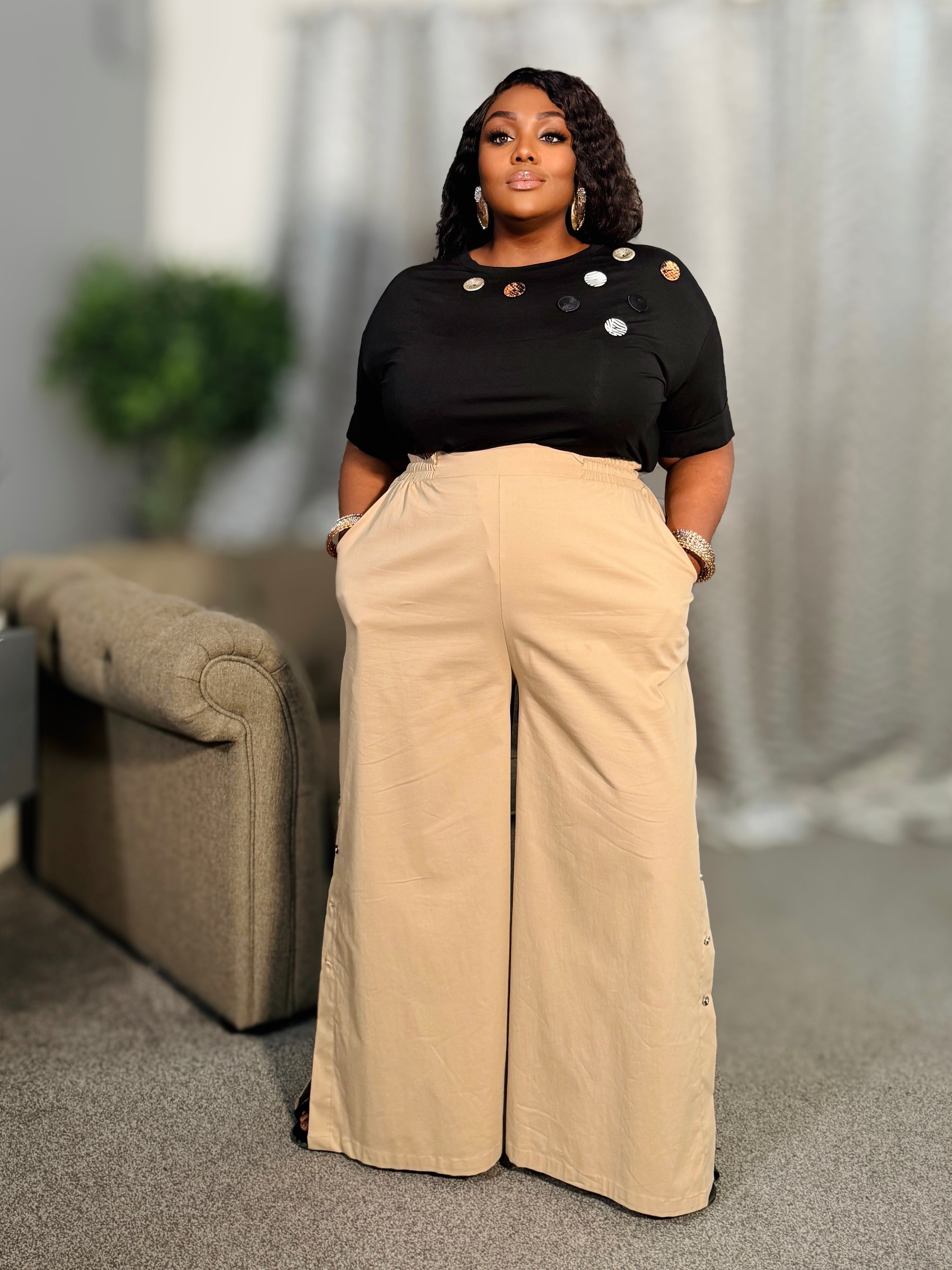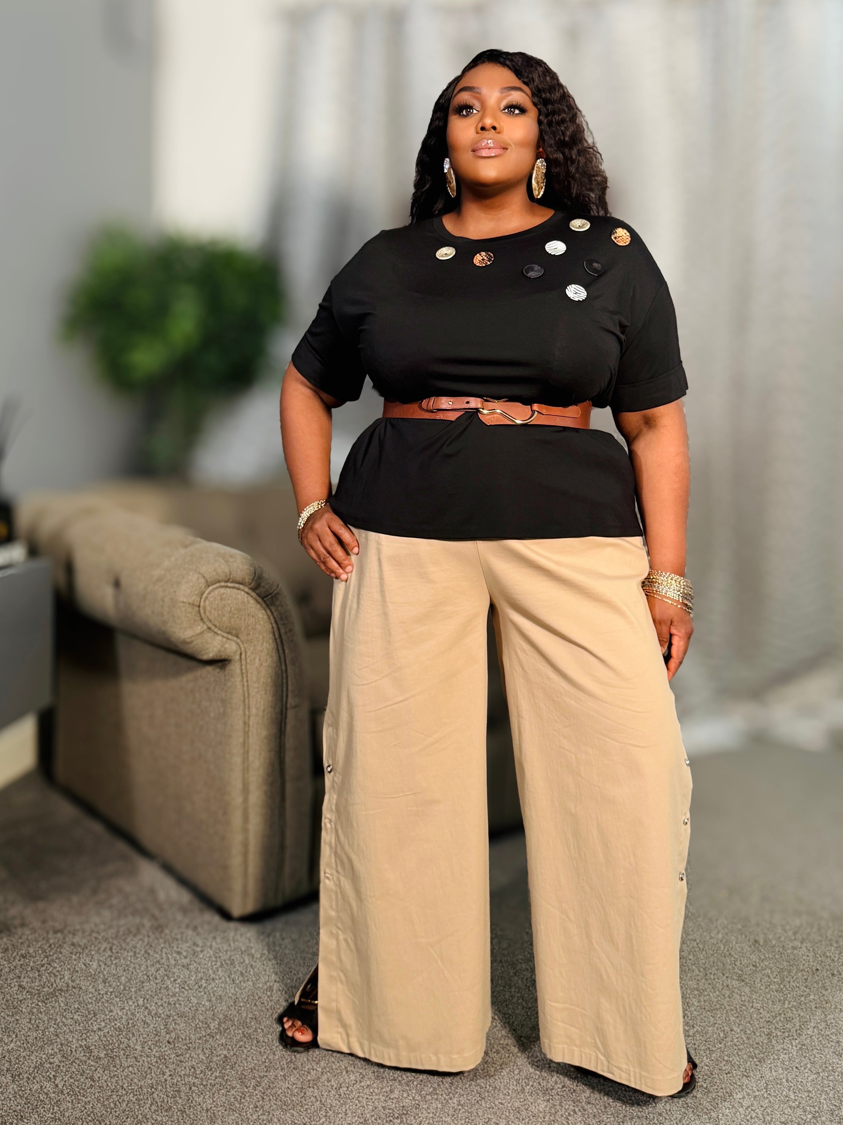 Unleash your inner confidence with the Bold Essence Button Tee – where classic meets creative. Crafted from a soft, stretch cotton blend, this jet-black top stands out with its statement asymmetrical button detailing that adds just the right amount of edge. The relaxed fit cinches at the waist with a belt or can be worn loose for effortless versatility.