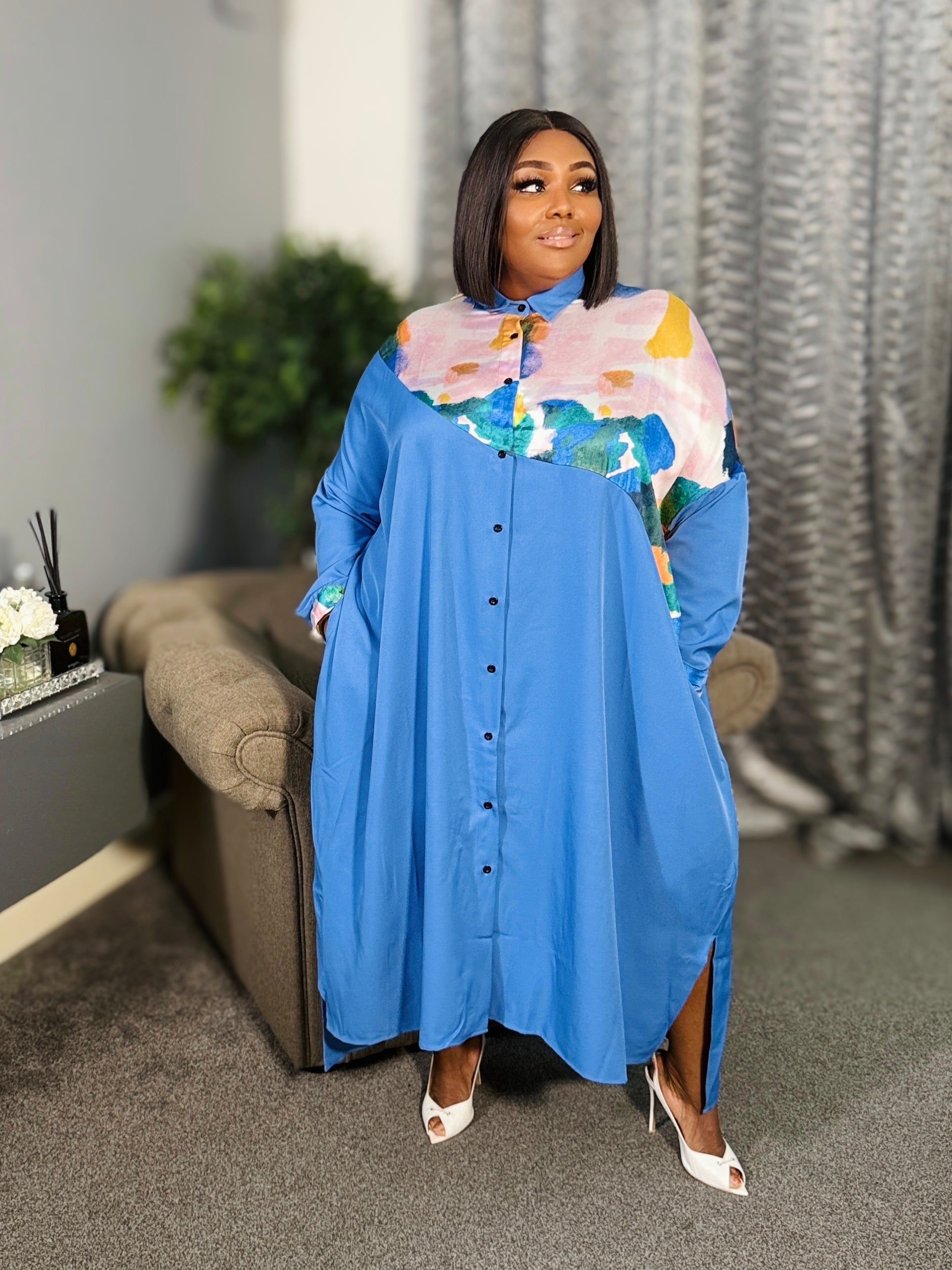 Turn heads effortlessly in The Zaria Abstract Maxi Shirt Dress — where comfort meets contemporary flair. Crafted from a soft, flowy fabric, this vibrant shirt dress features an artistic abstract print across the shoulders that adds a playful pop of colour to the bold cobalt-blue base.