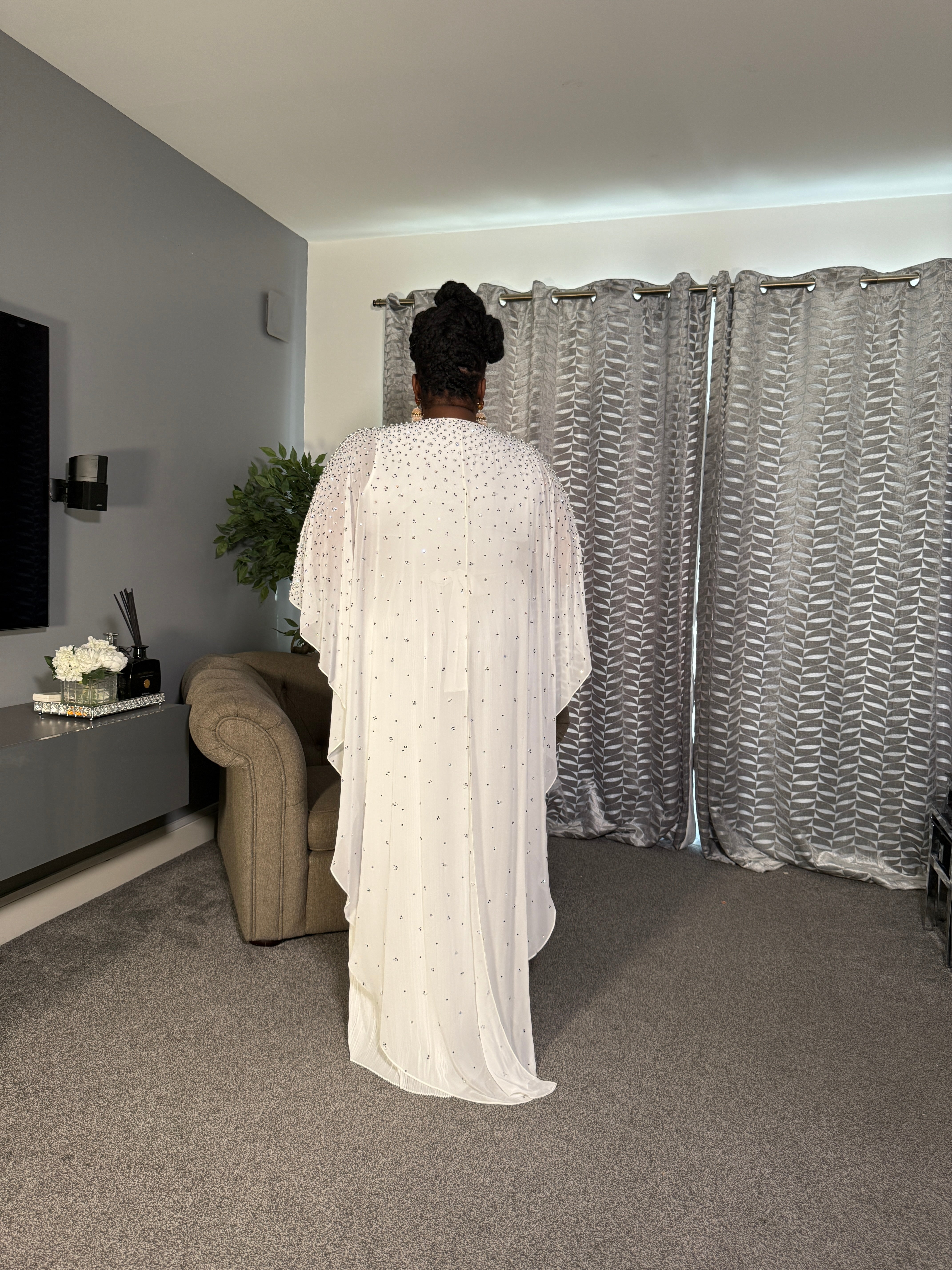 The bodice is adorned with shimmering rhinestones, creating a dazzling effect that catches the light beautifully. A dramatic cape drapes over the shoulders and back, adding an ethereal touch while enhancing the overall design’s regal appeal. The round neckline and relaxed fit ensure comfort without compromising style, while the cinched waist subtly defines the figure.