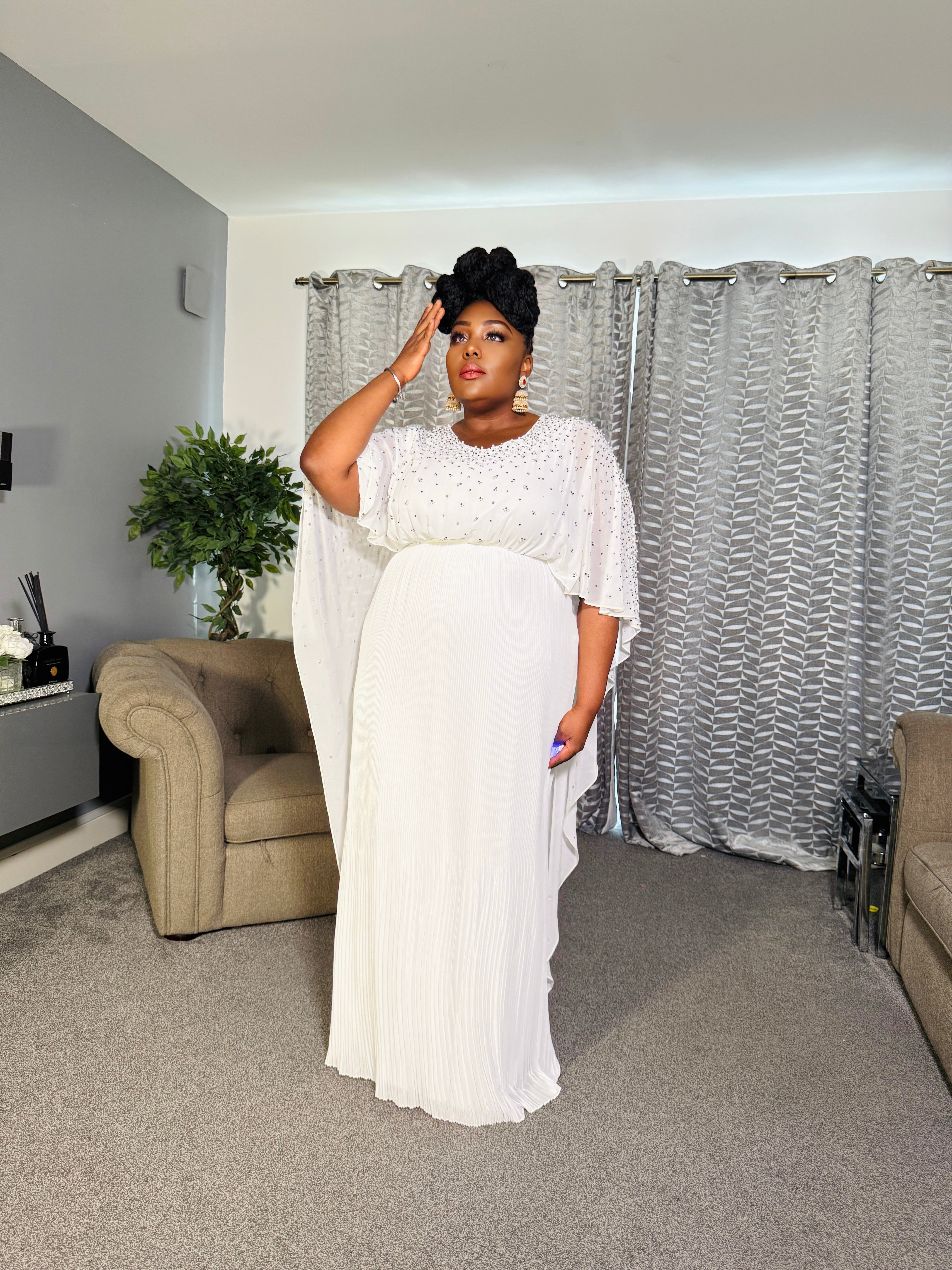 A breathtaking rhinestone-embellished dress exudes elegance and sophistication, perfect for formal events and special occasions. Crafted in a pristine white fabric, the dress features a flowy silhouette with a floor-length pleated skirt that adds movement and grace.