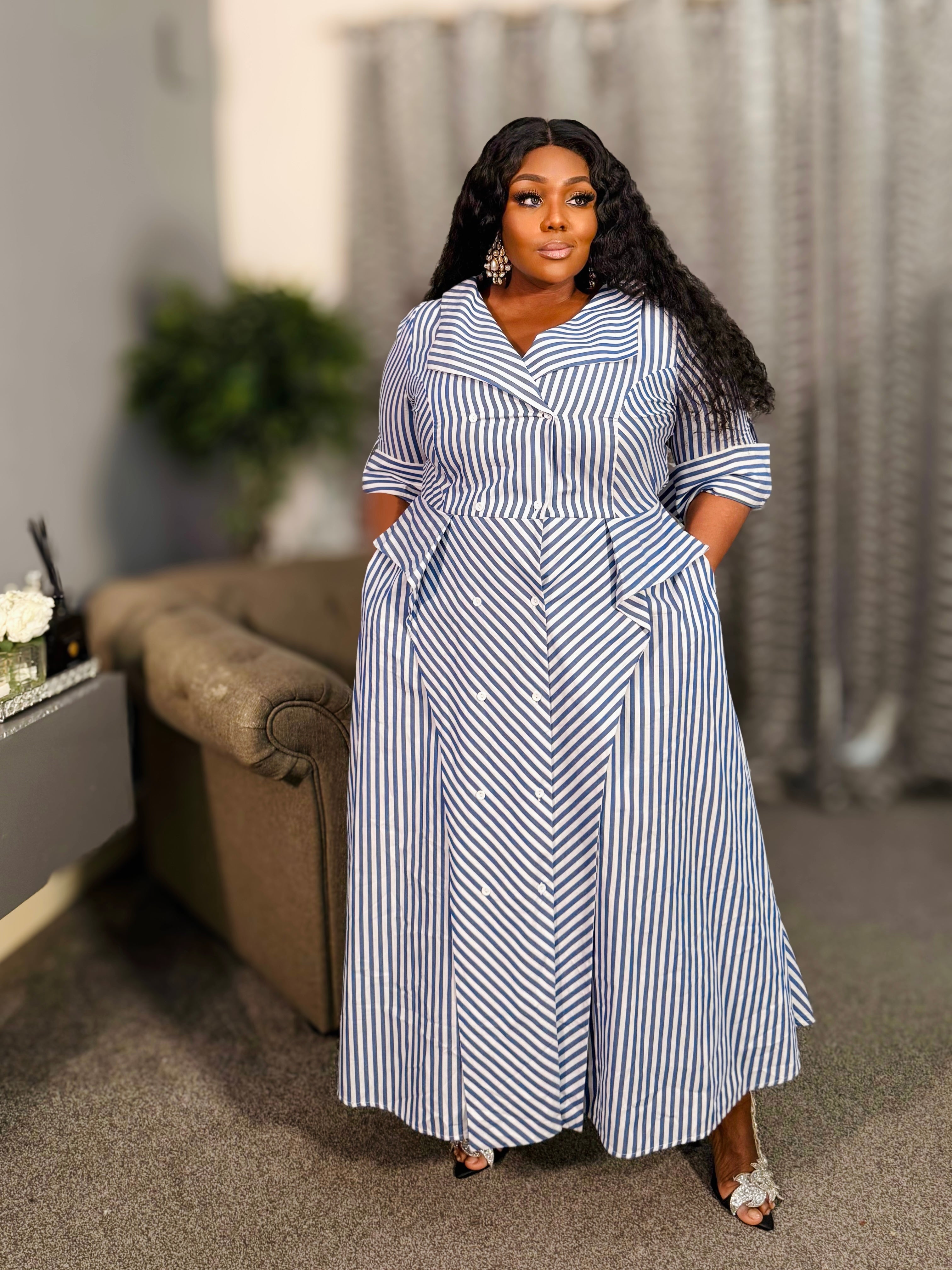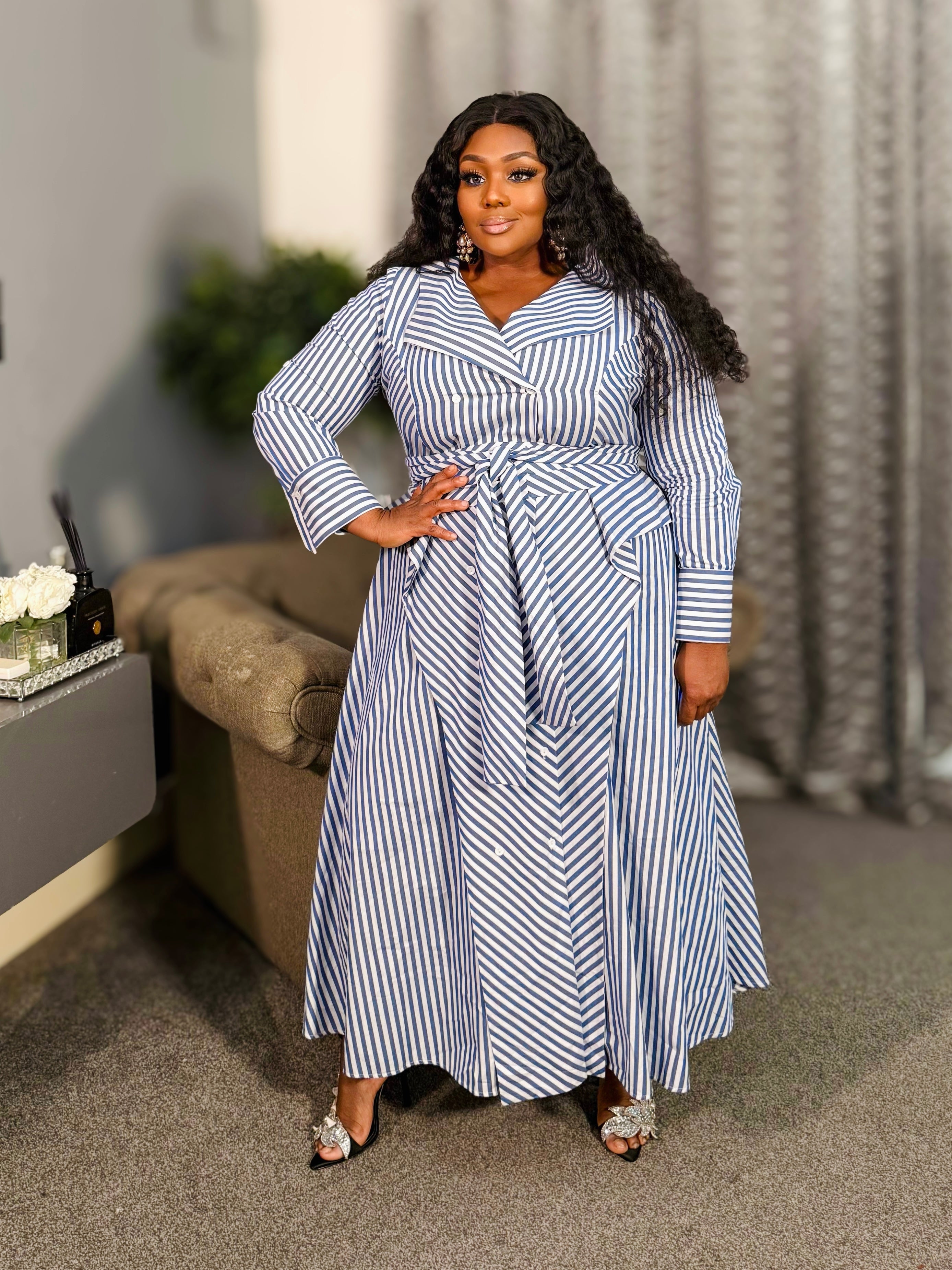 Crafted in a premium structured cotton-blend fabric, this striped maxi shirt dress features classic vertical blue and white stripes that create a lengthening effect while sculpting your shape beautifully. The adjustable tie ribbon waist belt cinches you in for a customised fit, giving you definition without restriction.