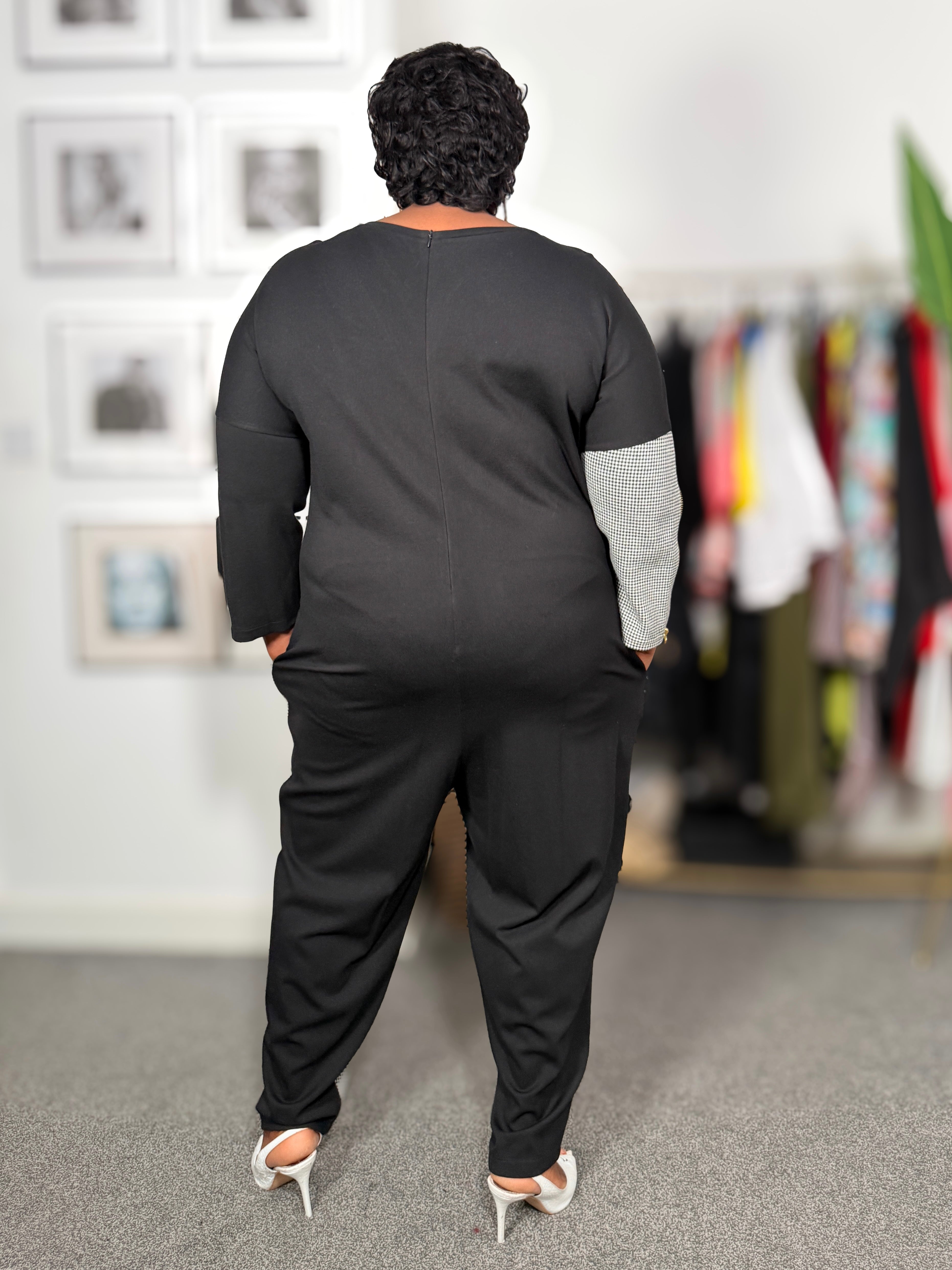 Featuring a striking two-tone design, this jumpsuit balances sleek black with textured contrast tailoring, creating a visually elongating silhouette that flatters every curve. The relaxed yet structured fit allows you to move with ease while still looking polished and put together.