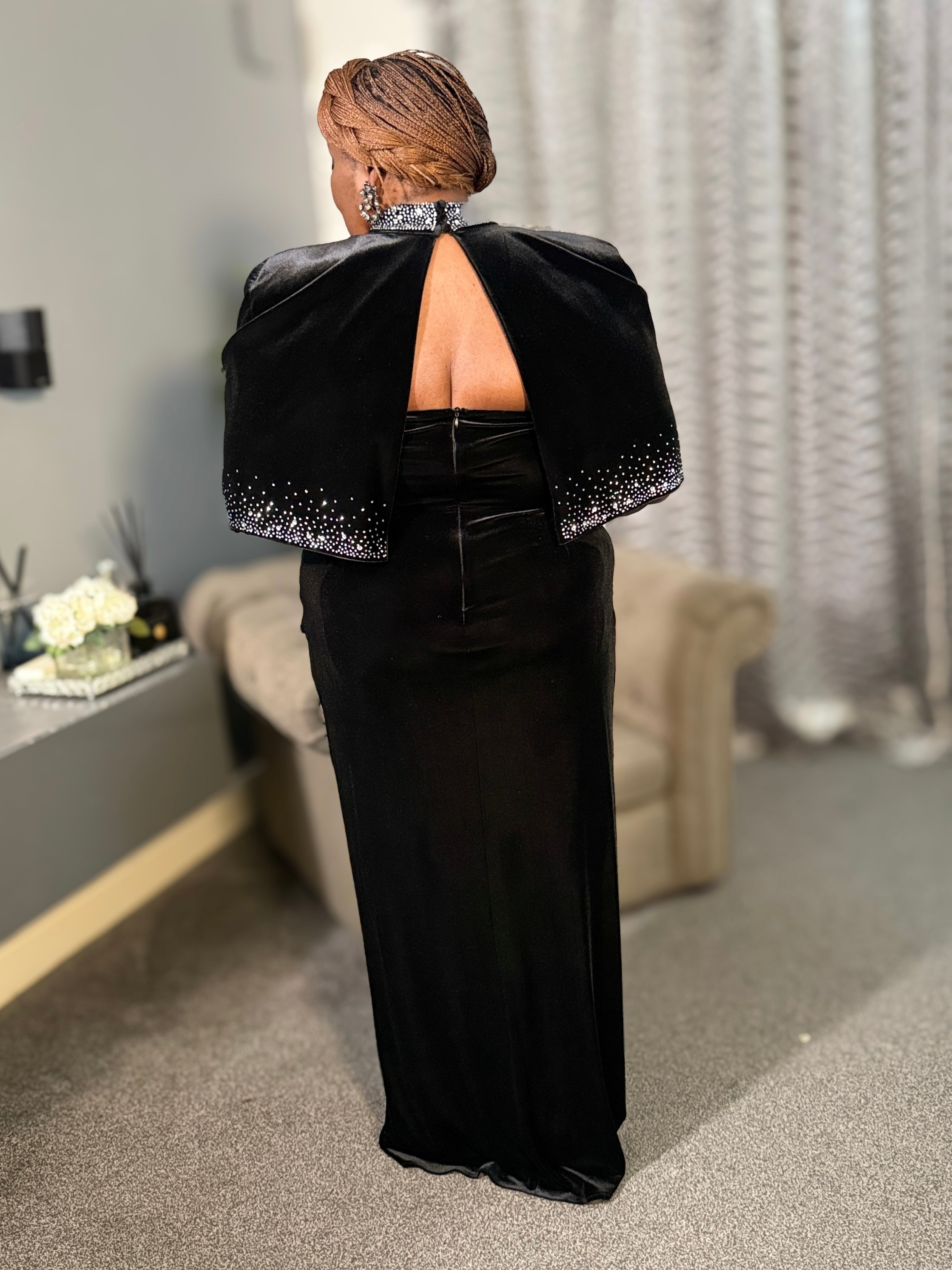 Designed in sumptuous black velvet, this gown glides effortlessly over your curves, offering a sleek, statuesque silhouette. Its true brilliance is revealed in the luxuriously embellished detachable cape, adorned with meticulously placed crystals that shimmer like stardust with every movement and a side slit.