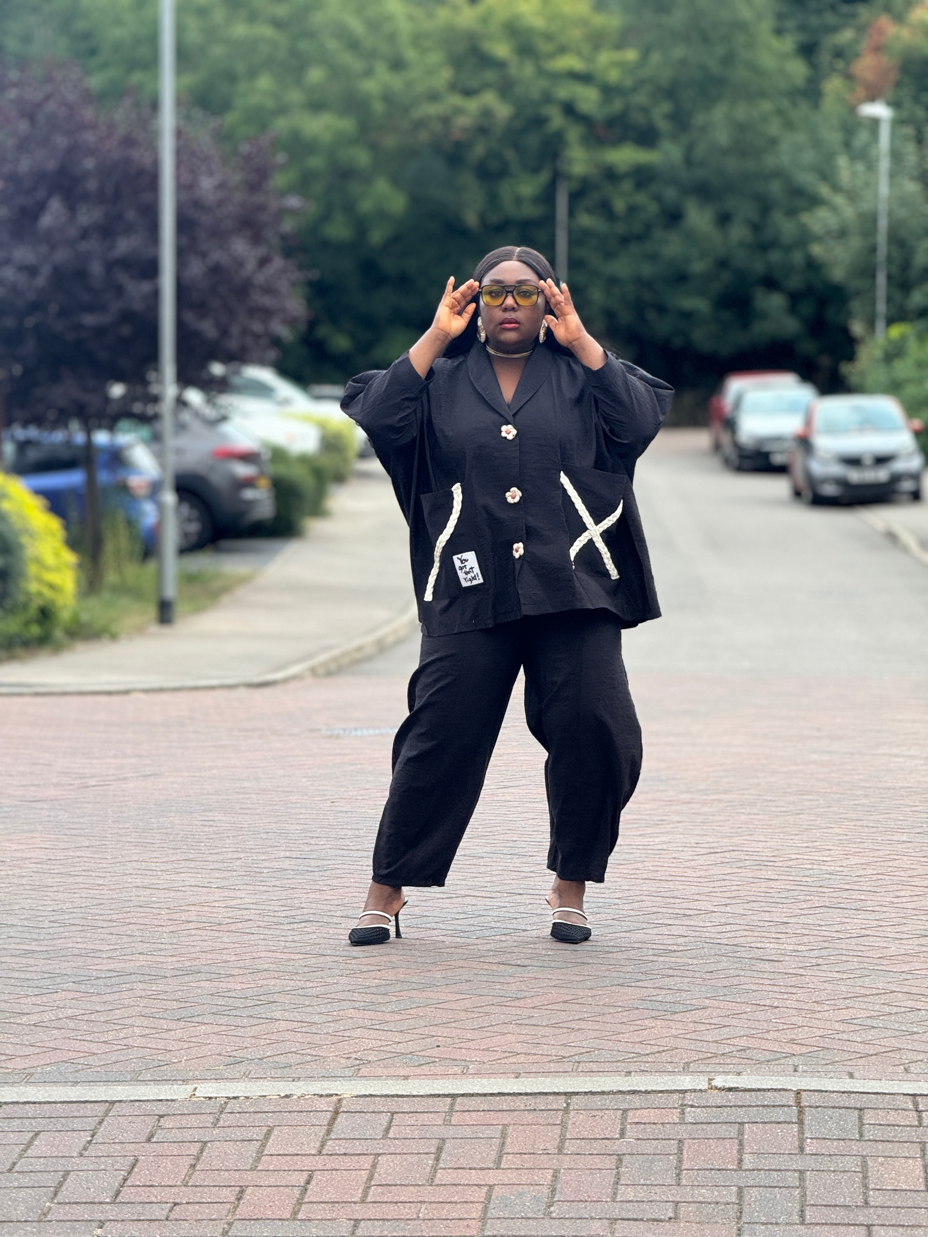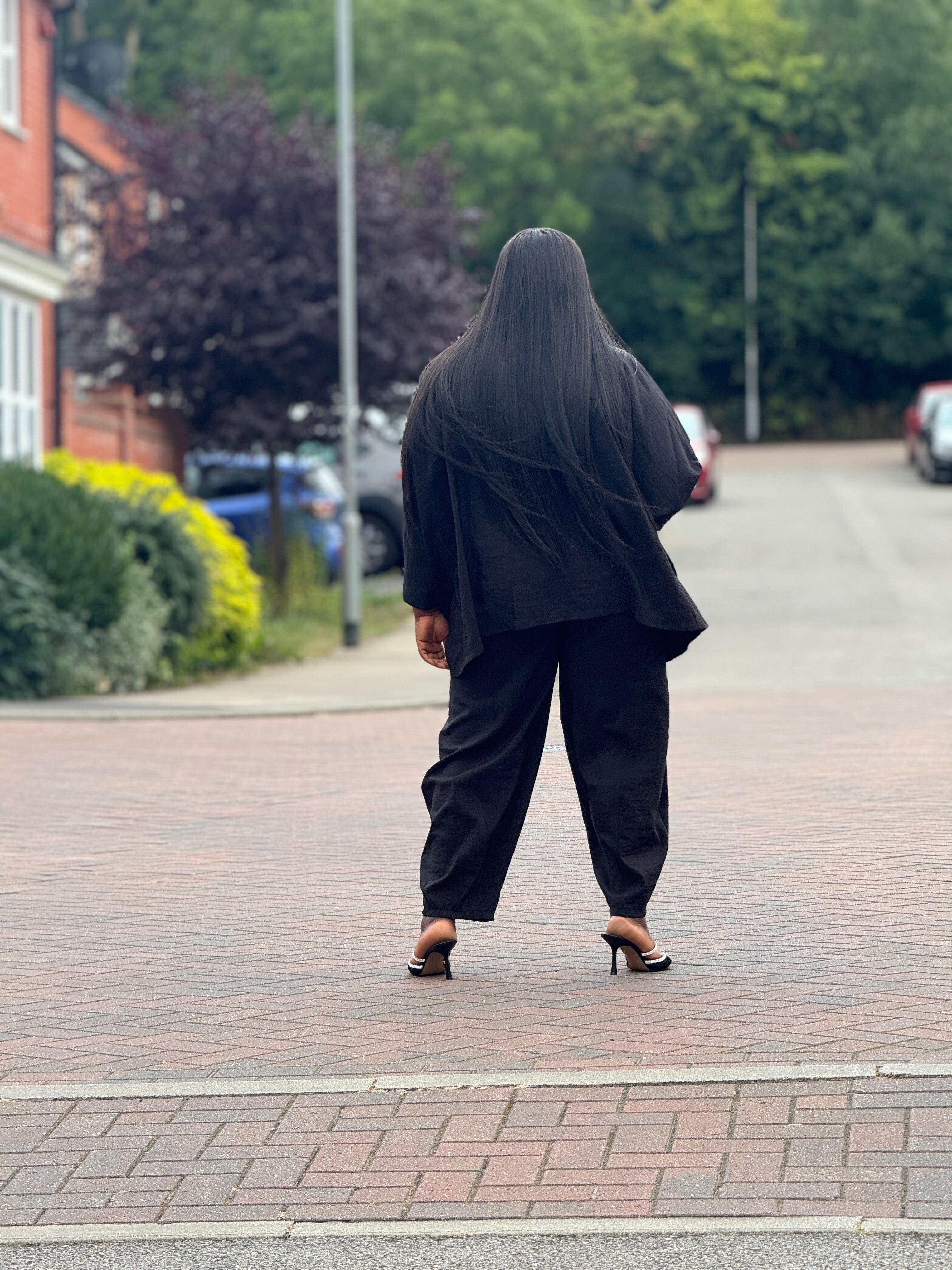 Contemporary assemble! Embrace Laid back Sophistication with this relaxed loose fit blouse and tailored cave trouser that sits high on the waist. So regal and wardrobe worthy.