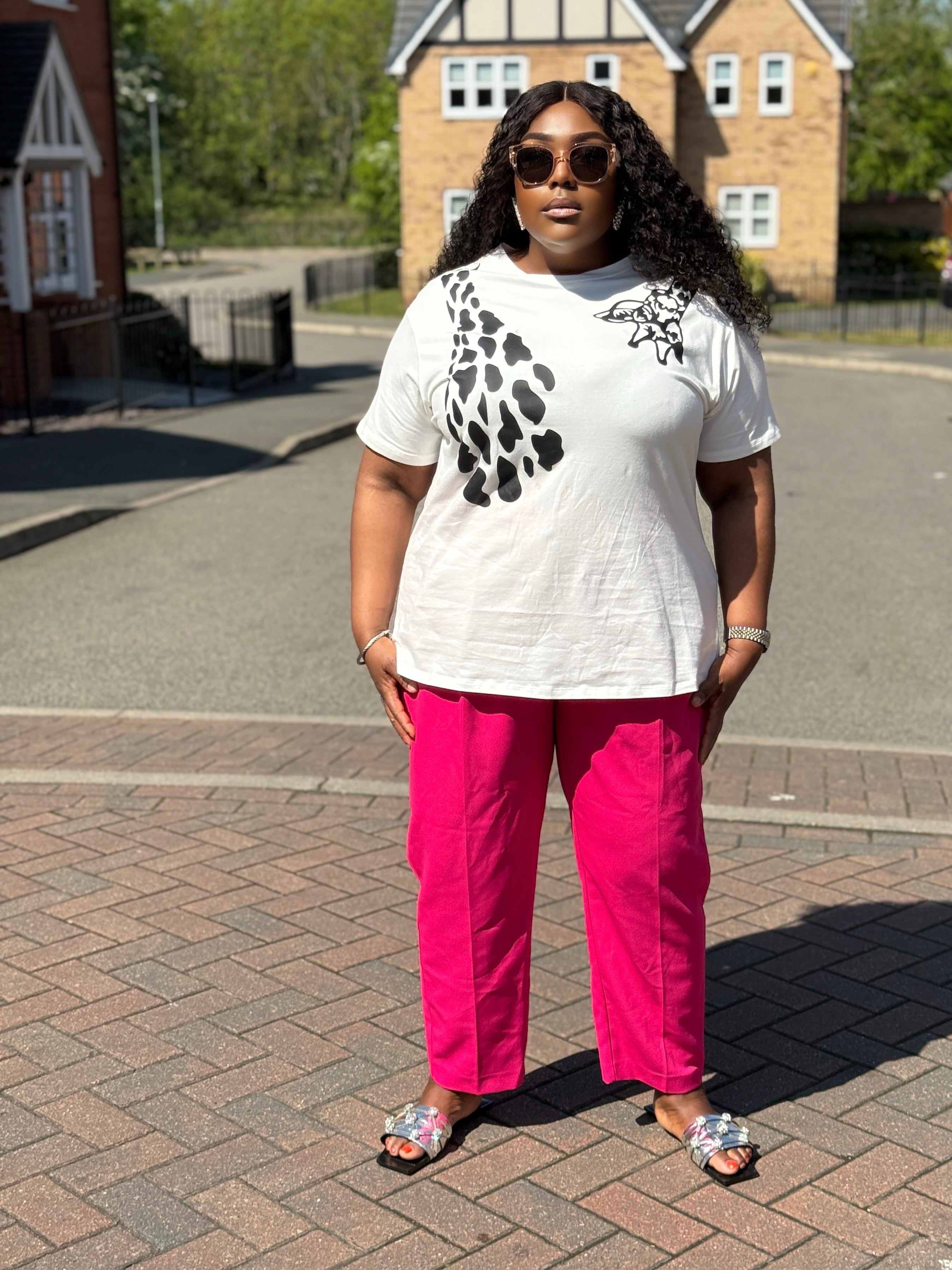 Let your outfit do the talking with our Femme Fierce Graphic Tee — a bold blend of art and attitude. Featuring an abstract floral and animal print design across the chest and shoulder, this monochrome masterpiece adds an edgy yet feminine touch to your everyday look.
