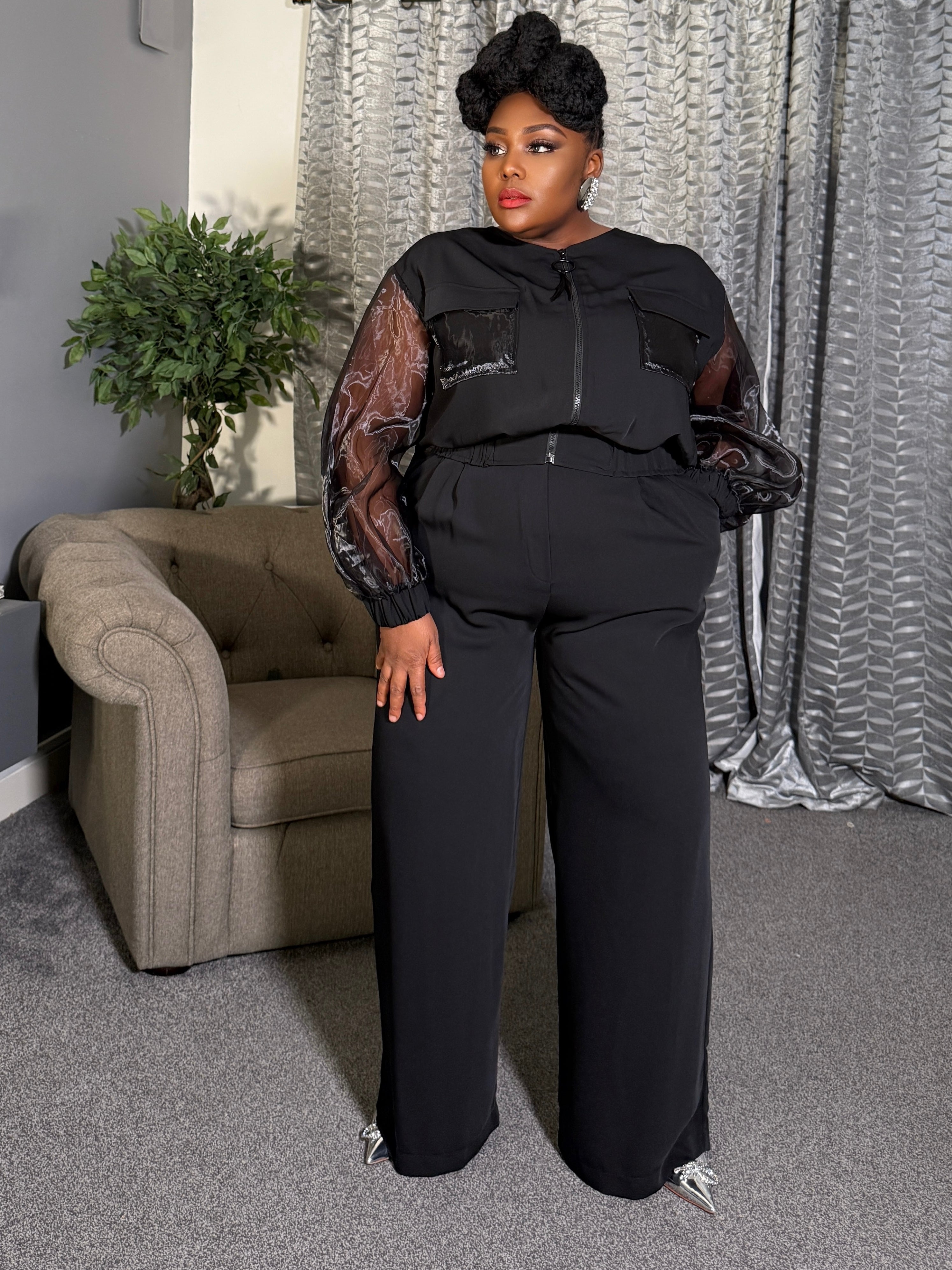 Elevate your style with our chic Organza Bomber Trouser Set – the perfect fusion of elegance and edge.