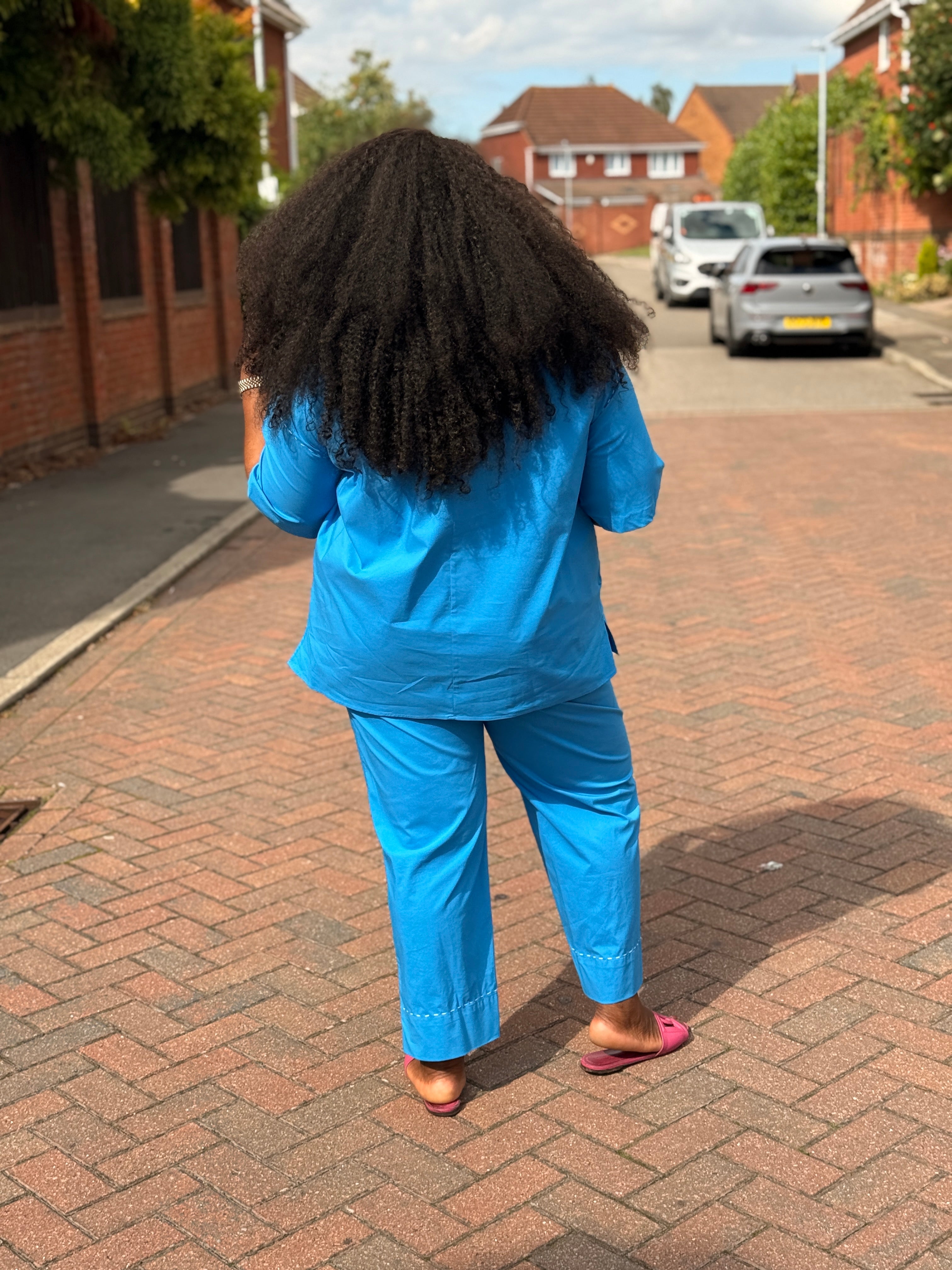 Bright, bold, and beautifully effortless — the Blue Sky Energy Co-Ord is your go-to set for commanding attention with grace. Crafted in a striking cerulean blue, this two-piece features a relaxed gathered-neck top with mid-length sleeves and matching cropped trousers with elegant hem detailing. The vivid colour energizes your presence, while the lightweight structure keeps you cool and confident all day long. This look is perfect for outdoor brunches, summer strolls, or when you simply want your outfit to do the talking.
