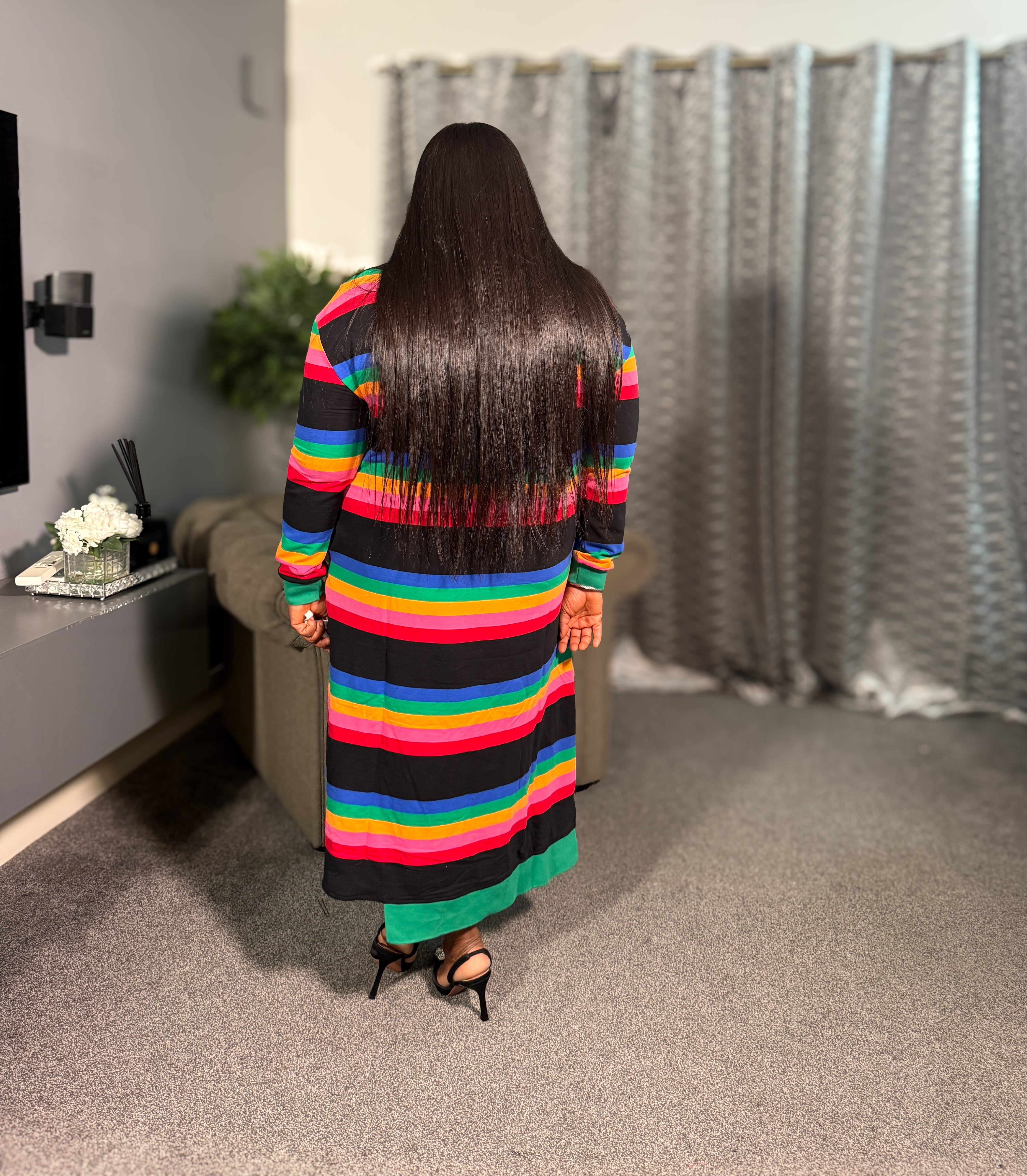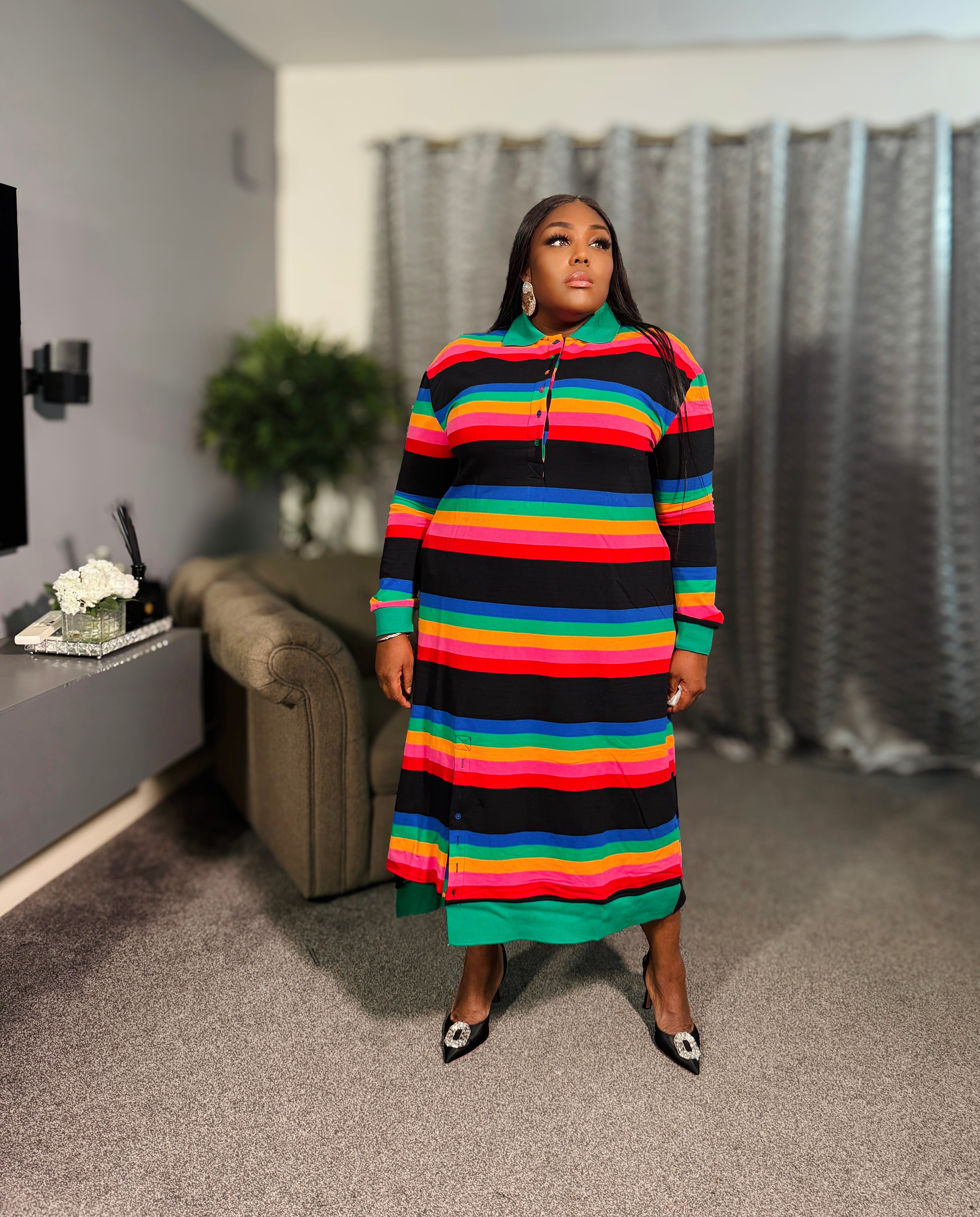 This midi-length dress features vibrant horizontal stripes in striking colours, creating a playful yet sophisticated look. Designed with a classic collared neckline and a button-down front finished with invisible side pockets and a closure at the bottom side of dress.