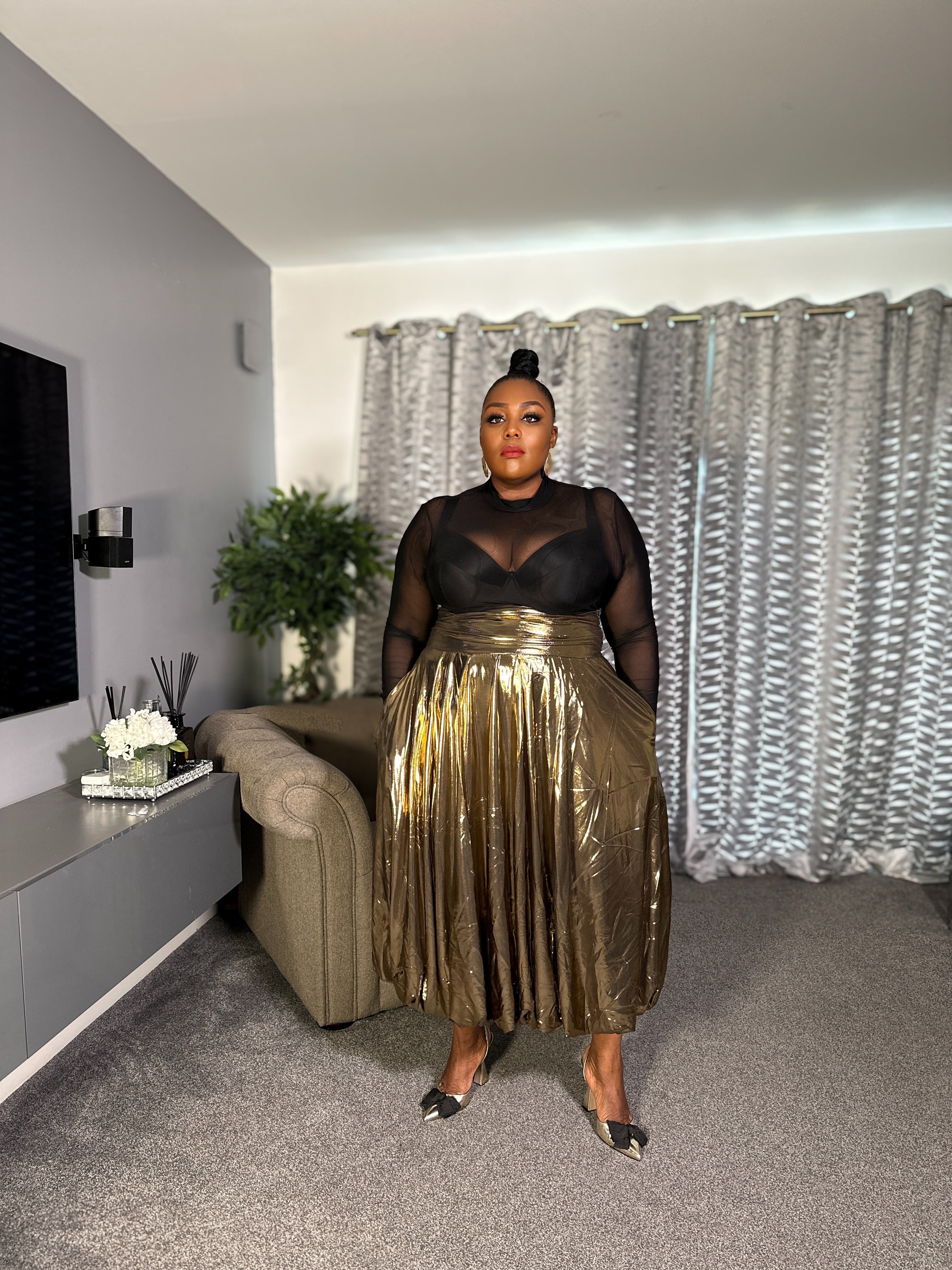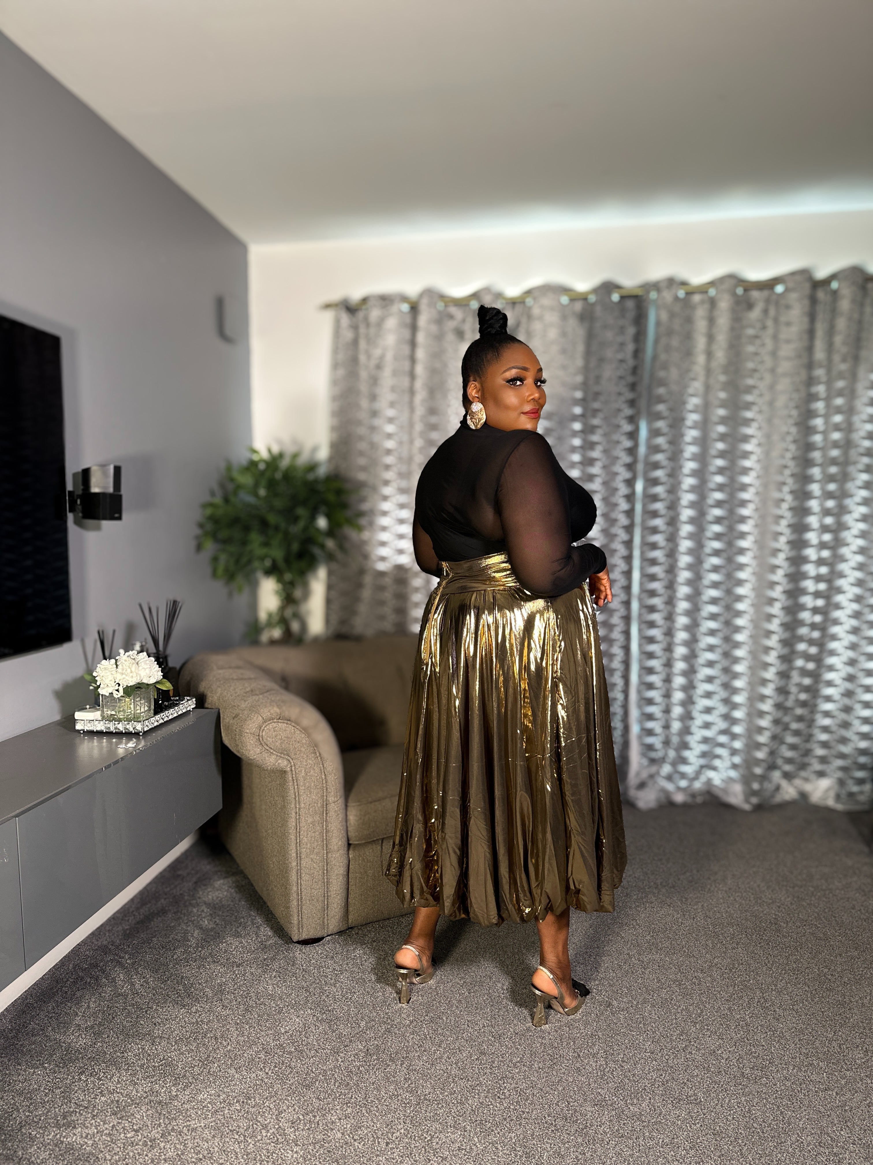 A bold statement piece with modern edge and playful volume. Made from shimmering metallic fabric, offering a futuristic yet elegant look. The high-waisted design flatters your figure, while the voluminous bubble shape adds a stylish contrast. Perfect for turning heads, it’s the ideal blend of sophistication and fun for those who love to stand out.