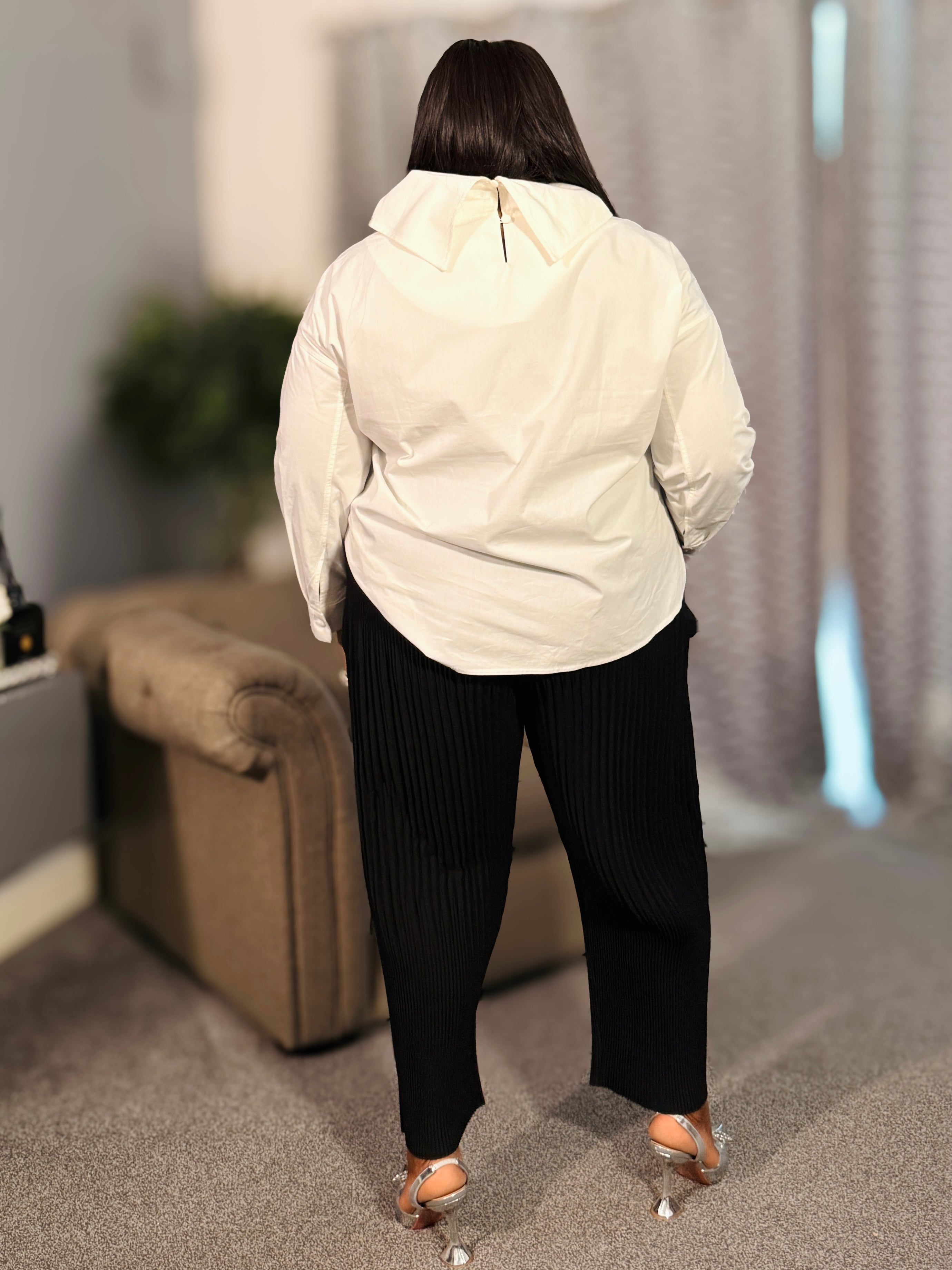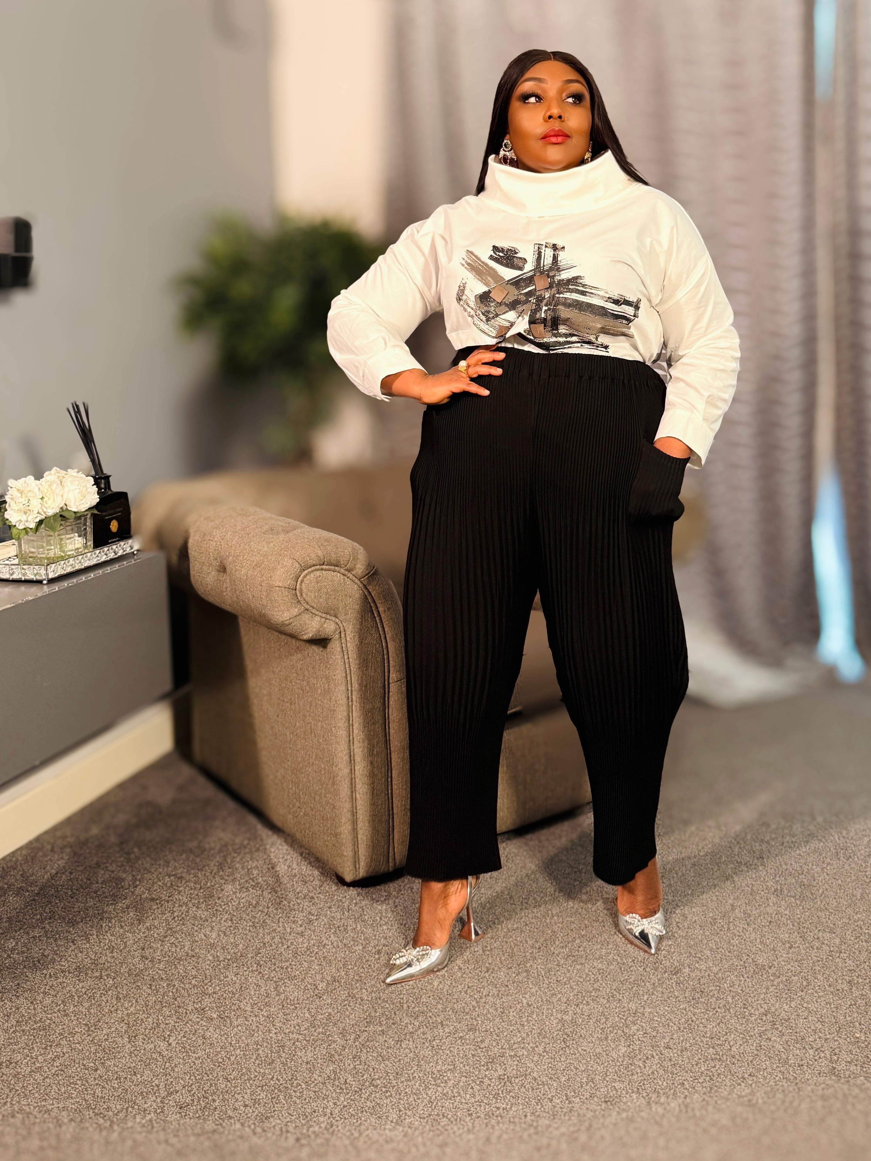 The Power Play Cowl-Neck Top features a softly structured cowl neckline that frames the face beautifully while offering coverage in all the right places. The abstract front print adds a modern, artistic edge, turning a classic white top into a statement without being loud.