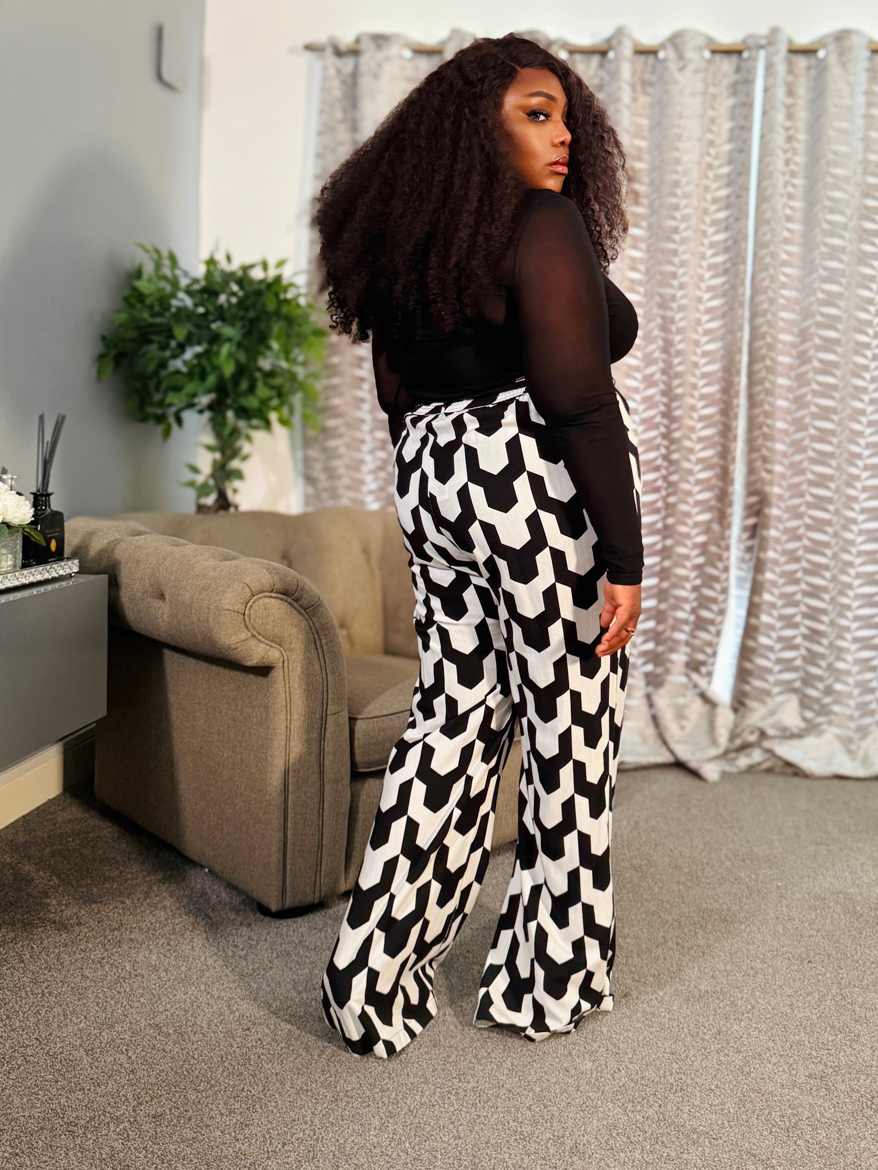 Step into your power with the Power Play trousers – where bold meets beautiful. Featuring a high-rise waist and a striking black-and-white geometric print, these wide-leg trousers are designed to flatter and elongate your silhouette. The soft, flowy fabric drapes effortlessly while the self-tie belt cinches your waist for a confidence-boosting fit that moves with you.