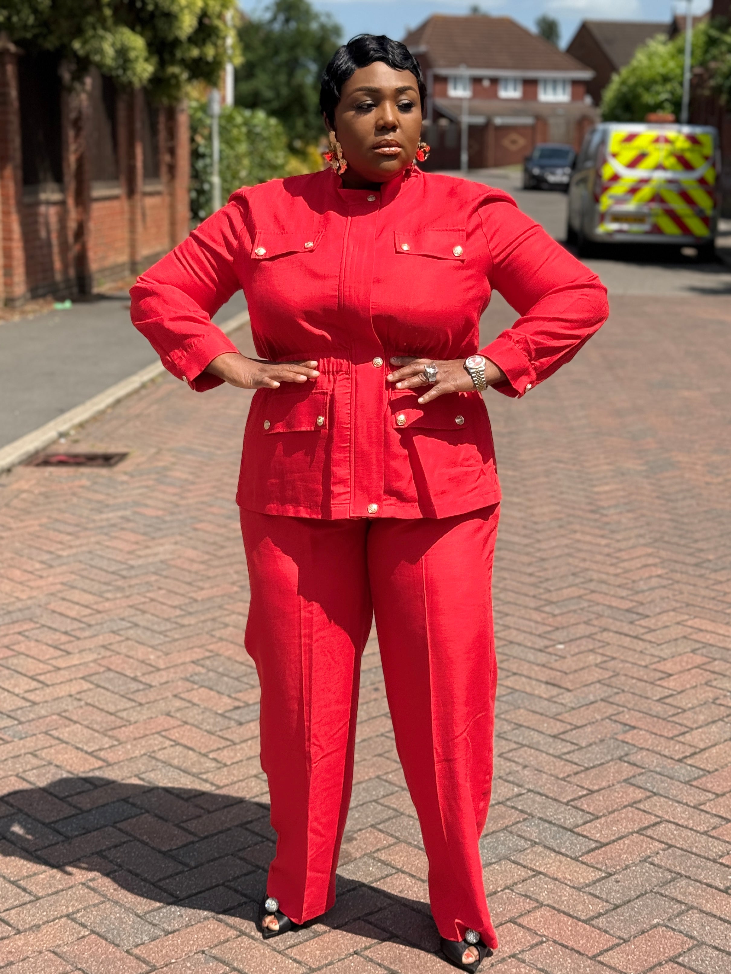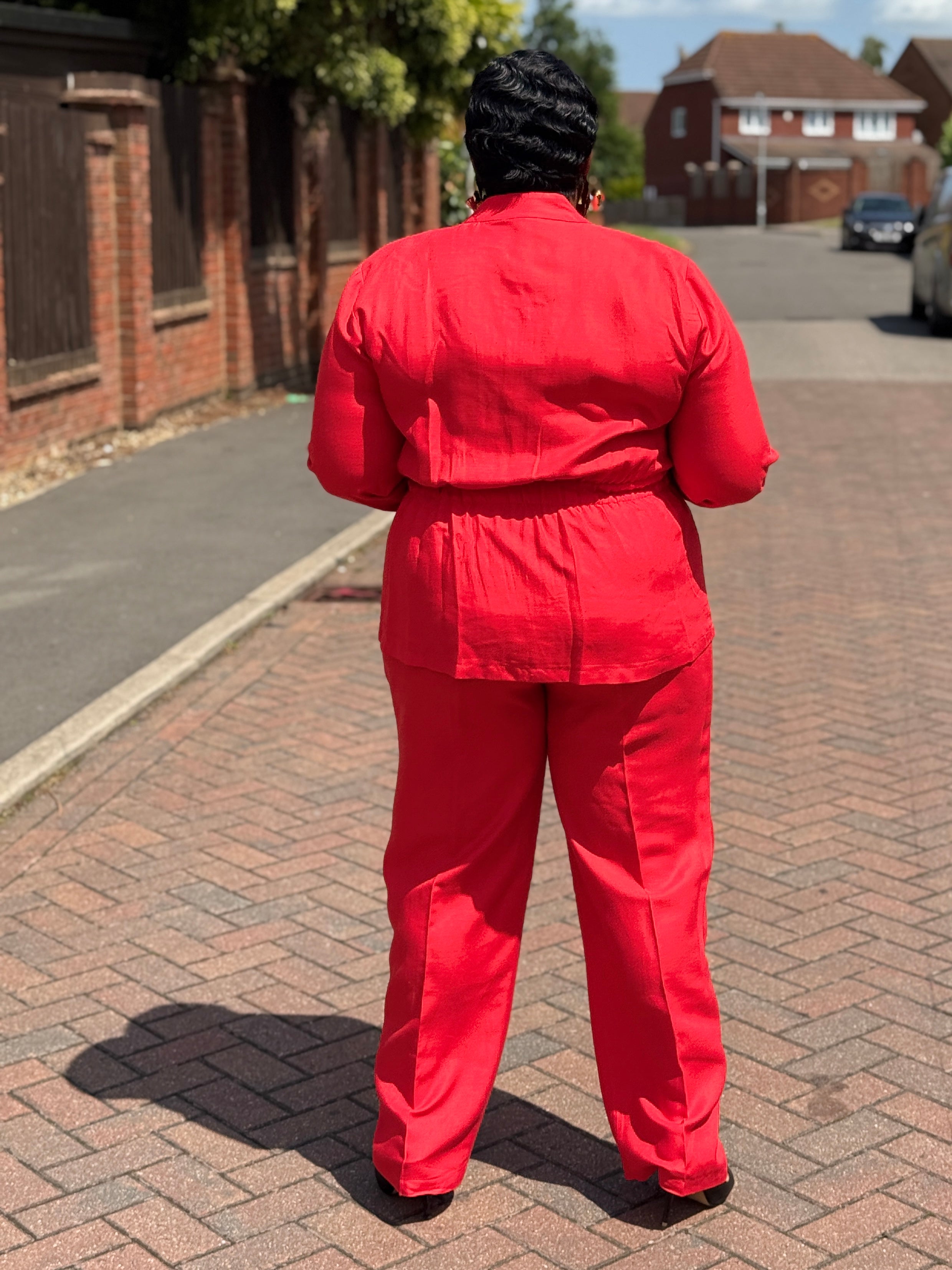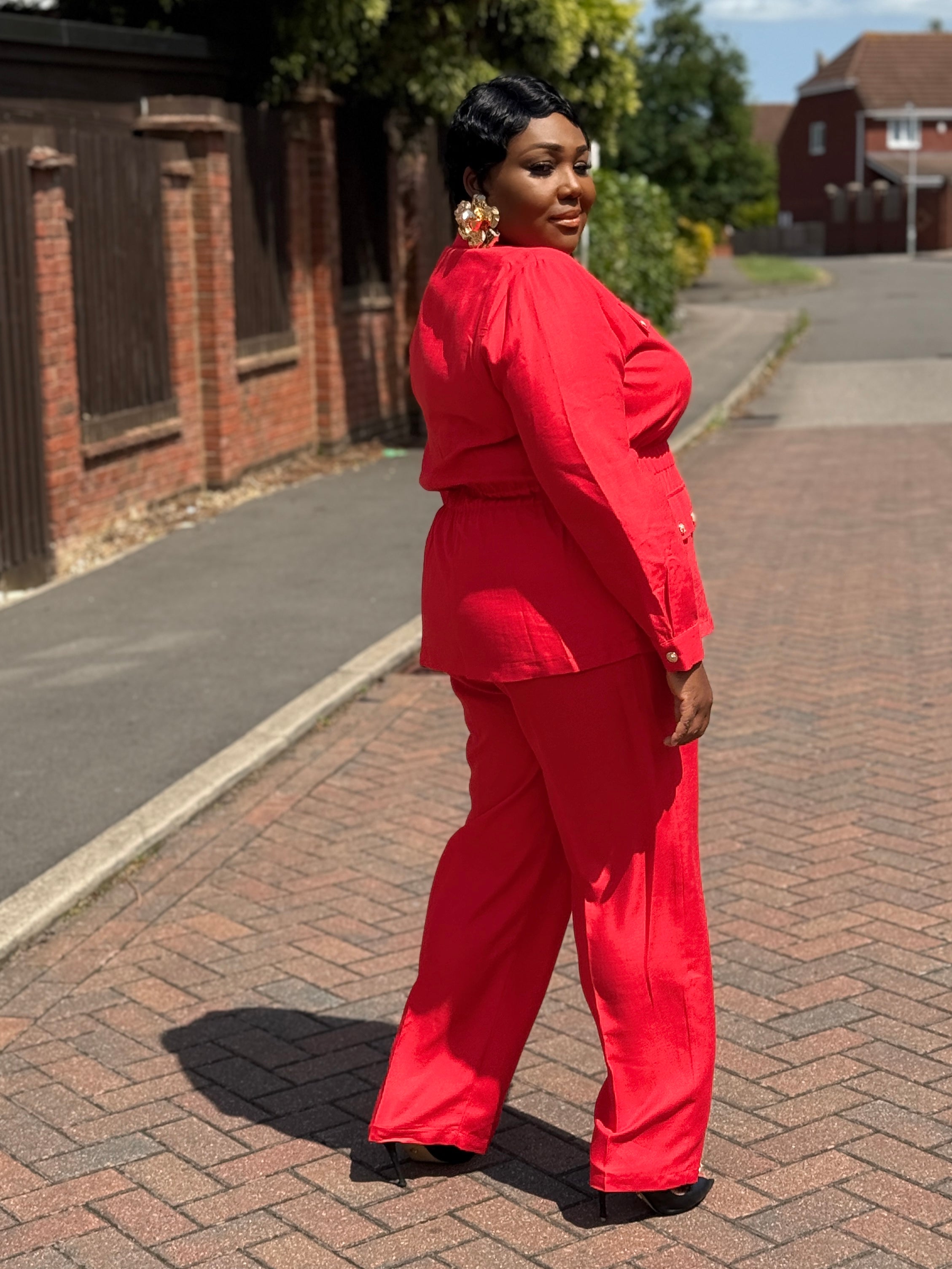Crafted in a Red hue, this set features a structured utility jacket with gold-tone button details, hidden Zipper with and a cinched waist that flatters your silhouette. The straight-leg trousers offer an elasticated waist with front zipper closure and a clean, elongated line that adds elegance to your stride.