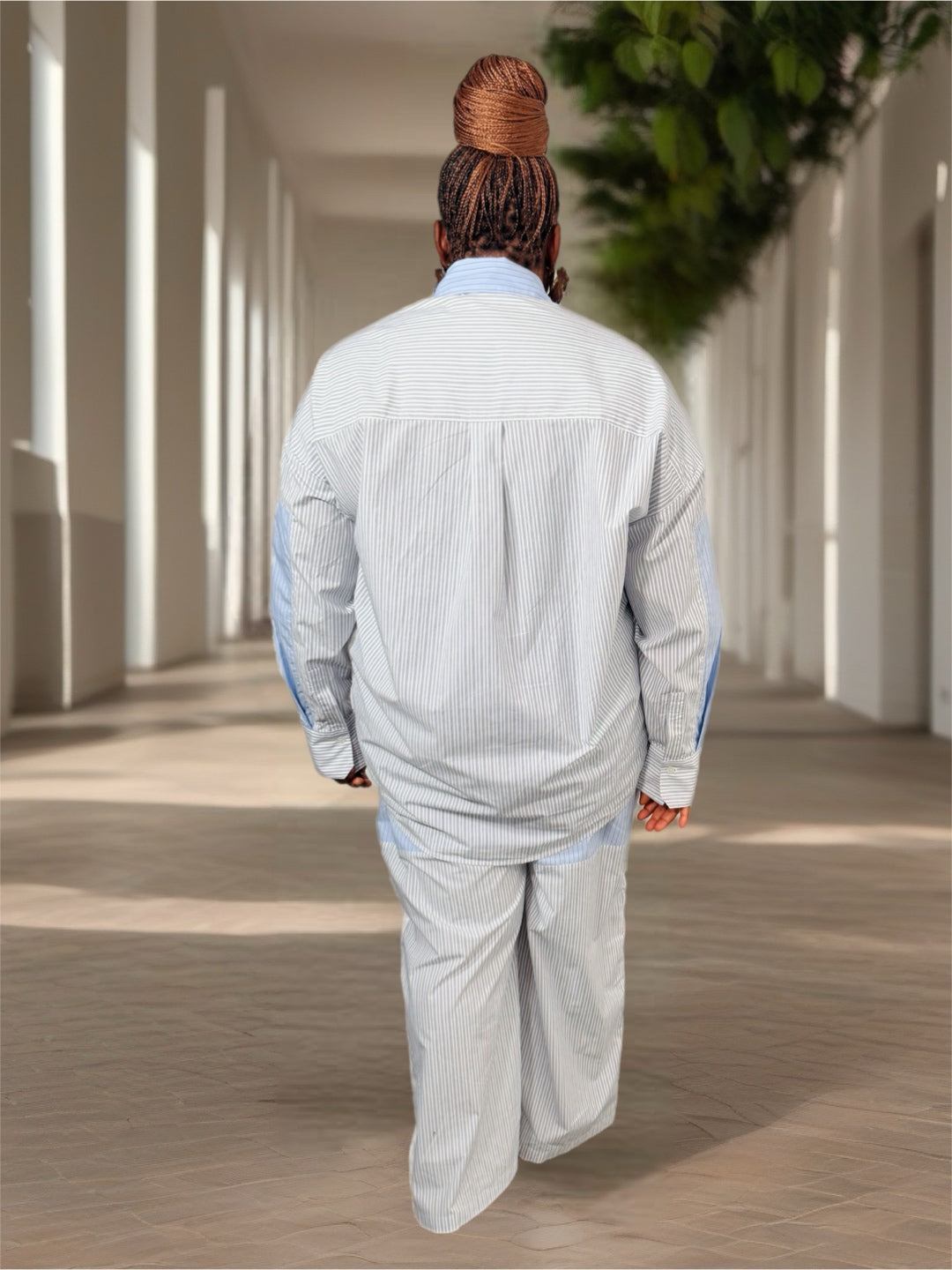 Step into effortless sophistication with The Power Stripe Co-Ord Set — a modern twist on classic tailoring. This oversized two-piece features a crisp, mixed-stripe shirt with contrast panels and a relaxed wide-leg trouser, blending structure with ease.
