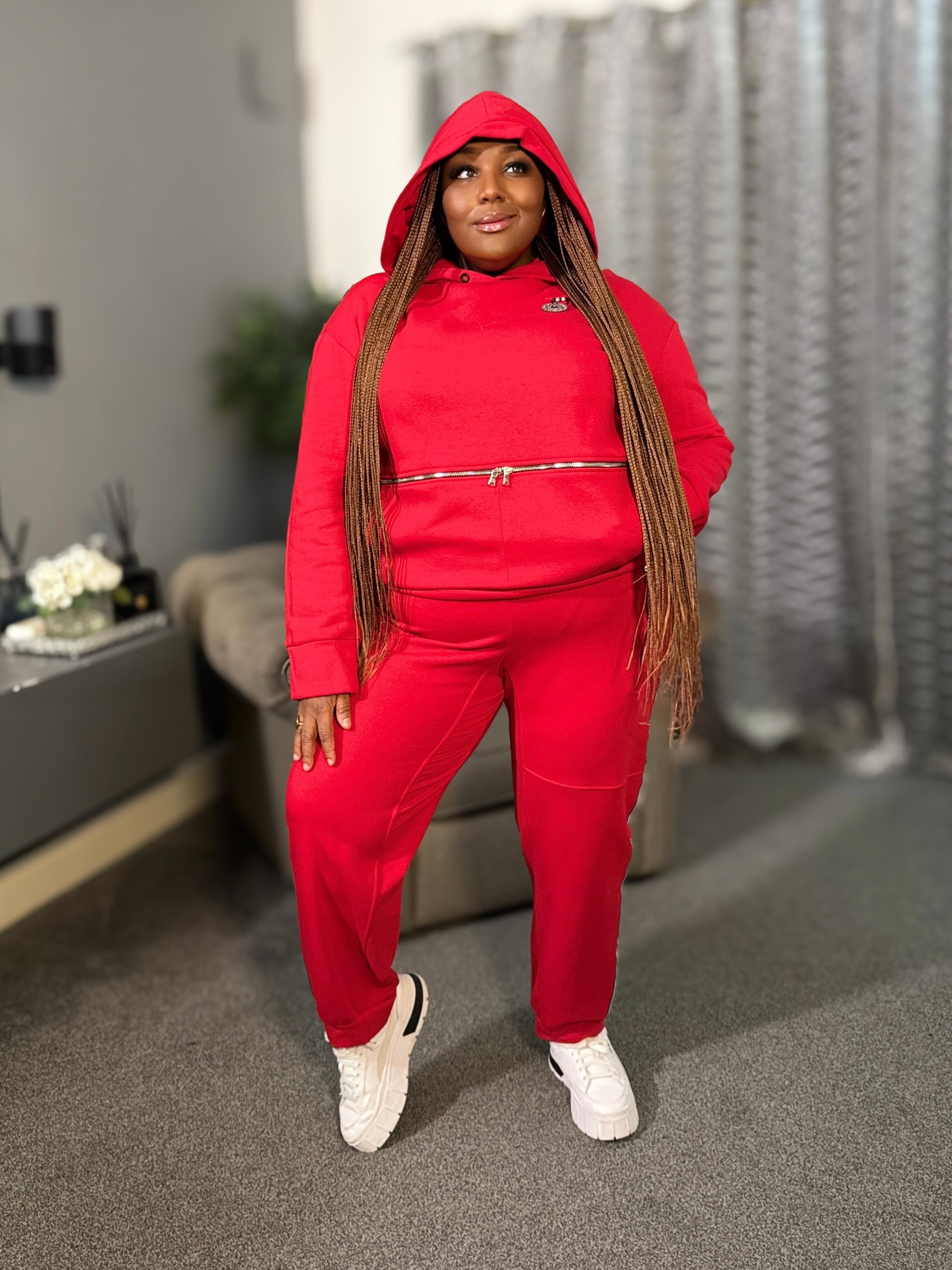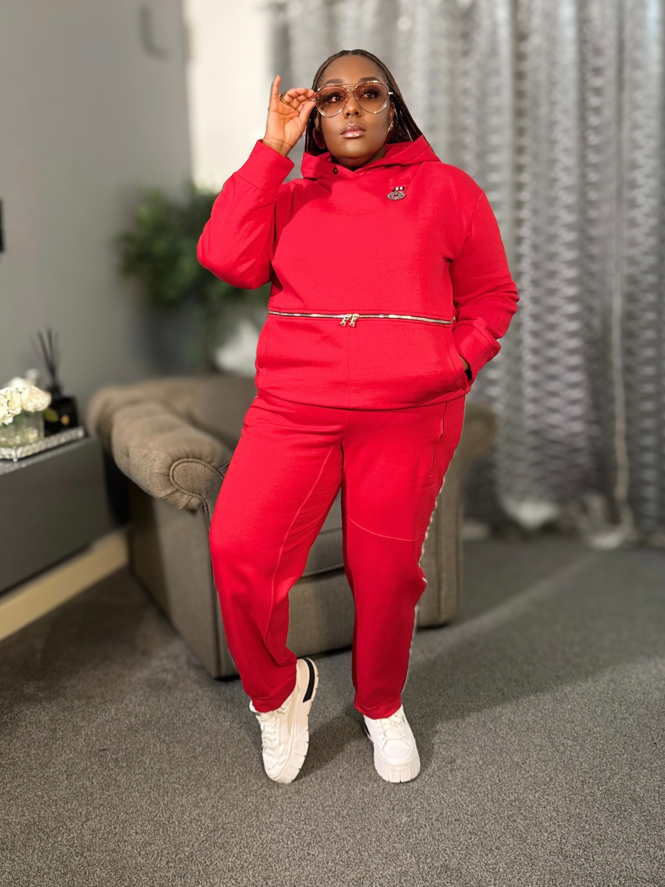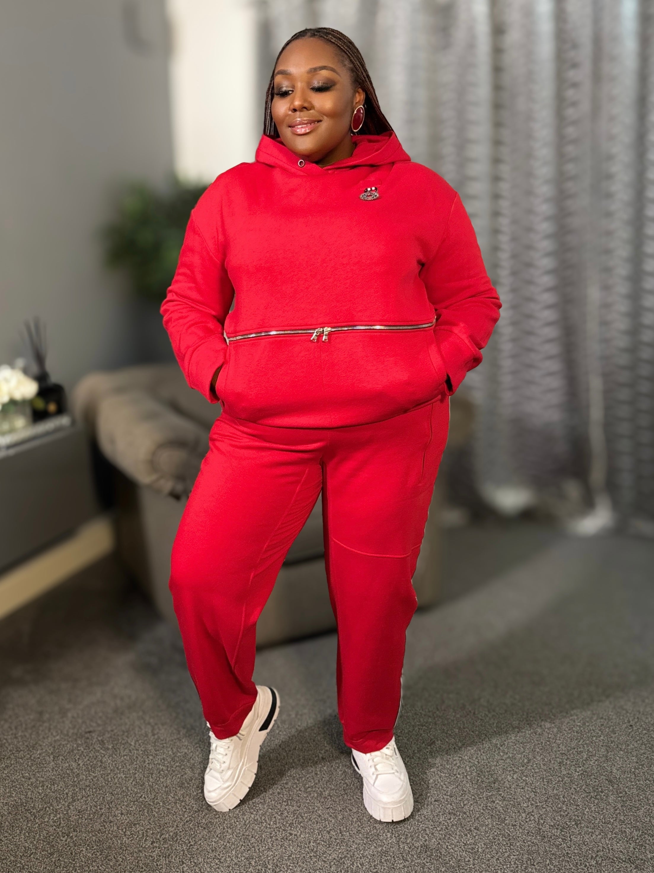 Made from a soft, breathable sweatshirt fabric that gently hugs your shape, the hoodie features a functional front zip pocket for practicality and style, while the matching joggers offer a flattering tapered fit that moves with you. The rich ruby red shade makes a bold statement, ensuring you stand out whether you’re running errands, travelling, or lounging in luxury.