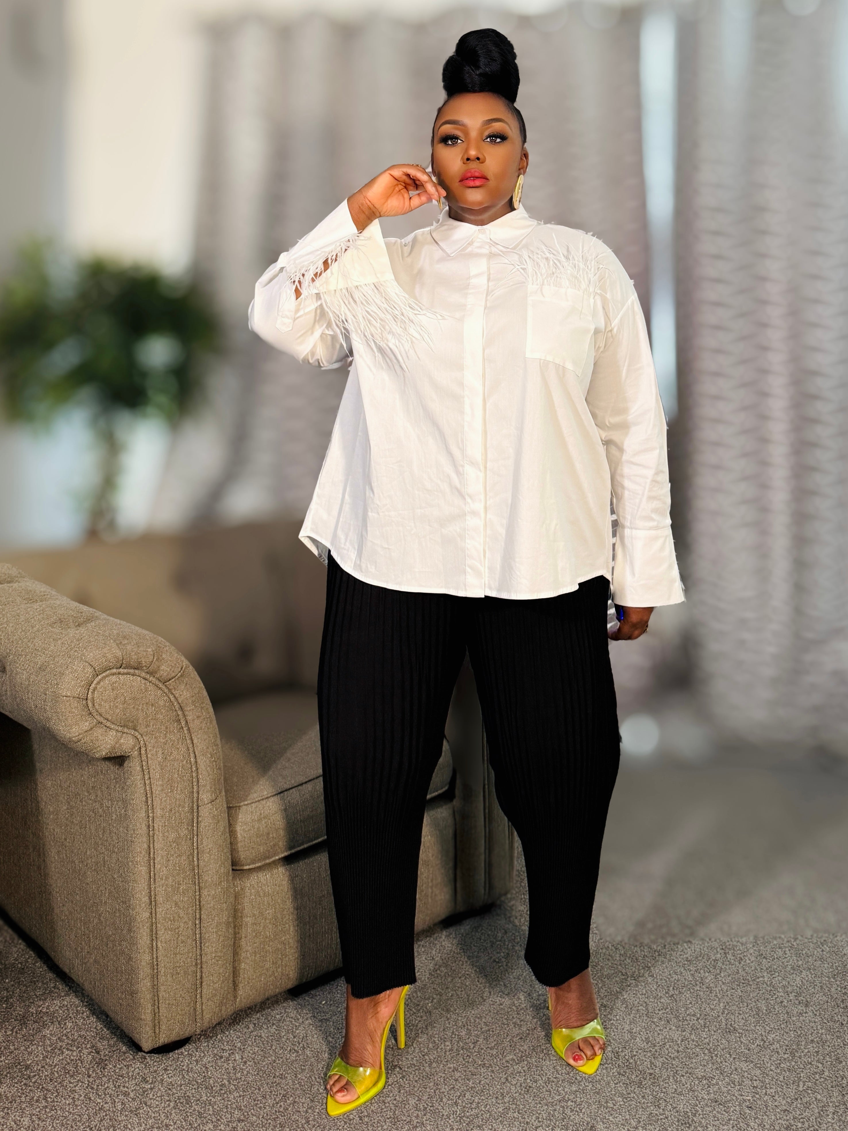 Make a bold yet effortless entrance with our Soar Feather Shirt — where classic tailoring meets playful drama. This crisp white button-down reimagines everyday elegance with soft feathered fringe detailing that dances along the chest and sleeves, turning a timeless silhouette into a standout moment.