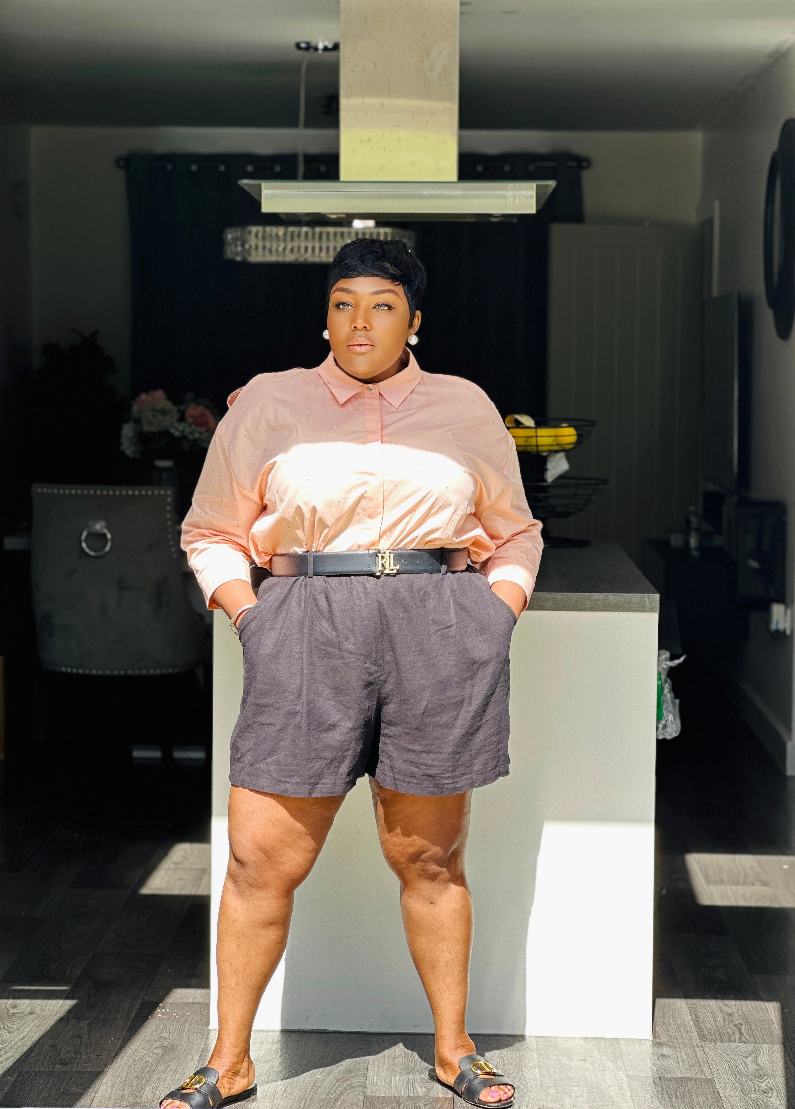 Features Include: Collar neckline, crystal embellishments, Cotton fabric, slit on shoulder, 3/4 sleeves with button cuff, curve hem, with full front button closure.
