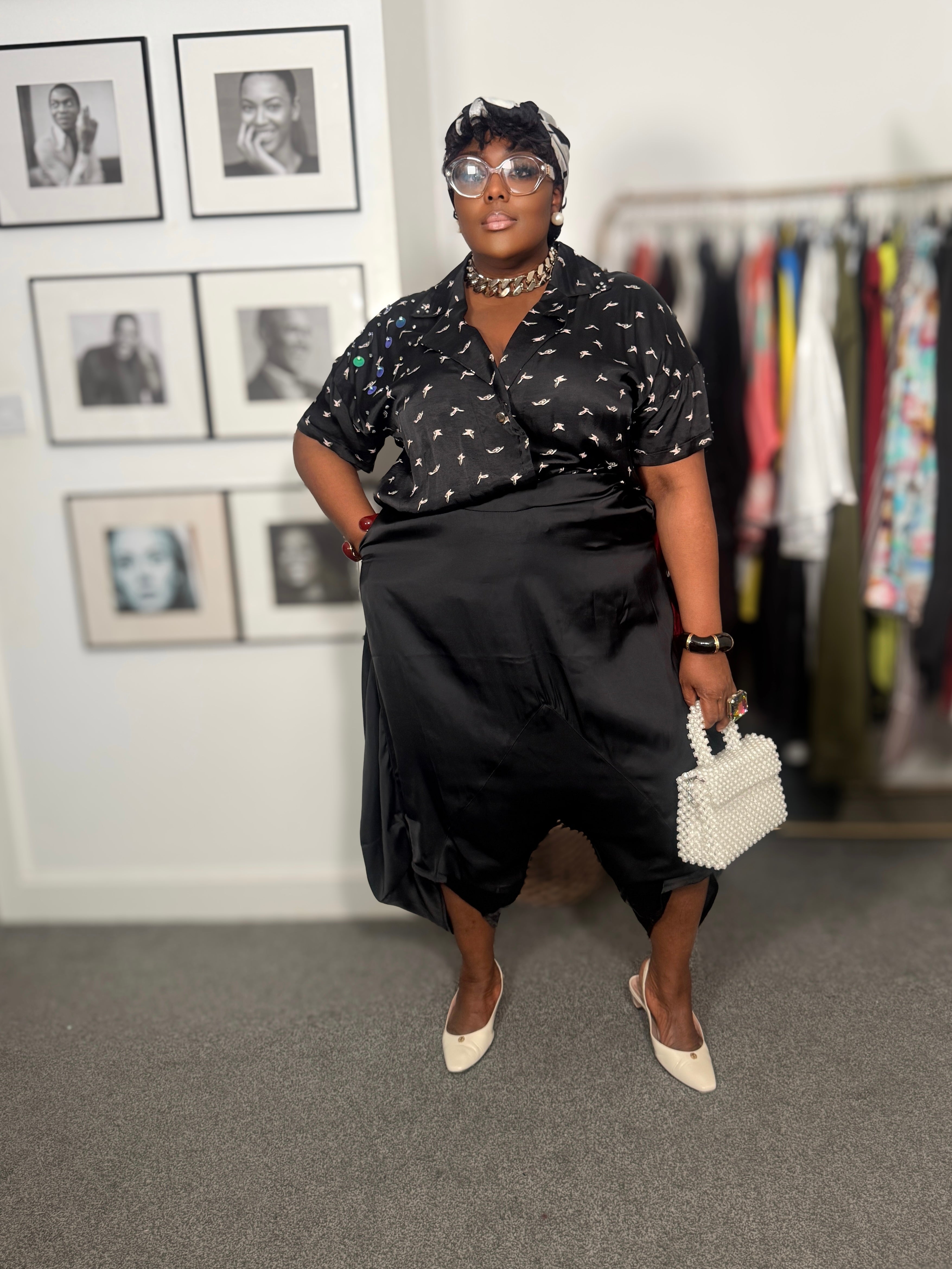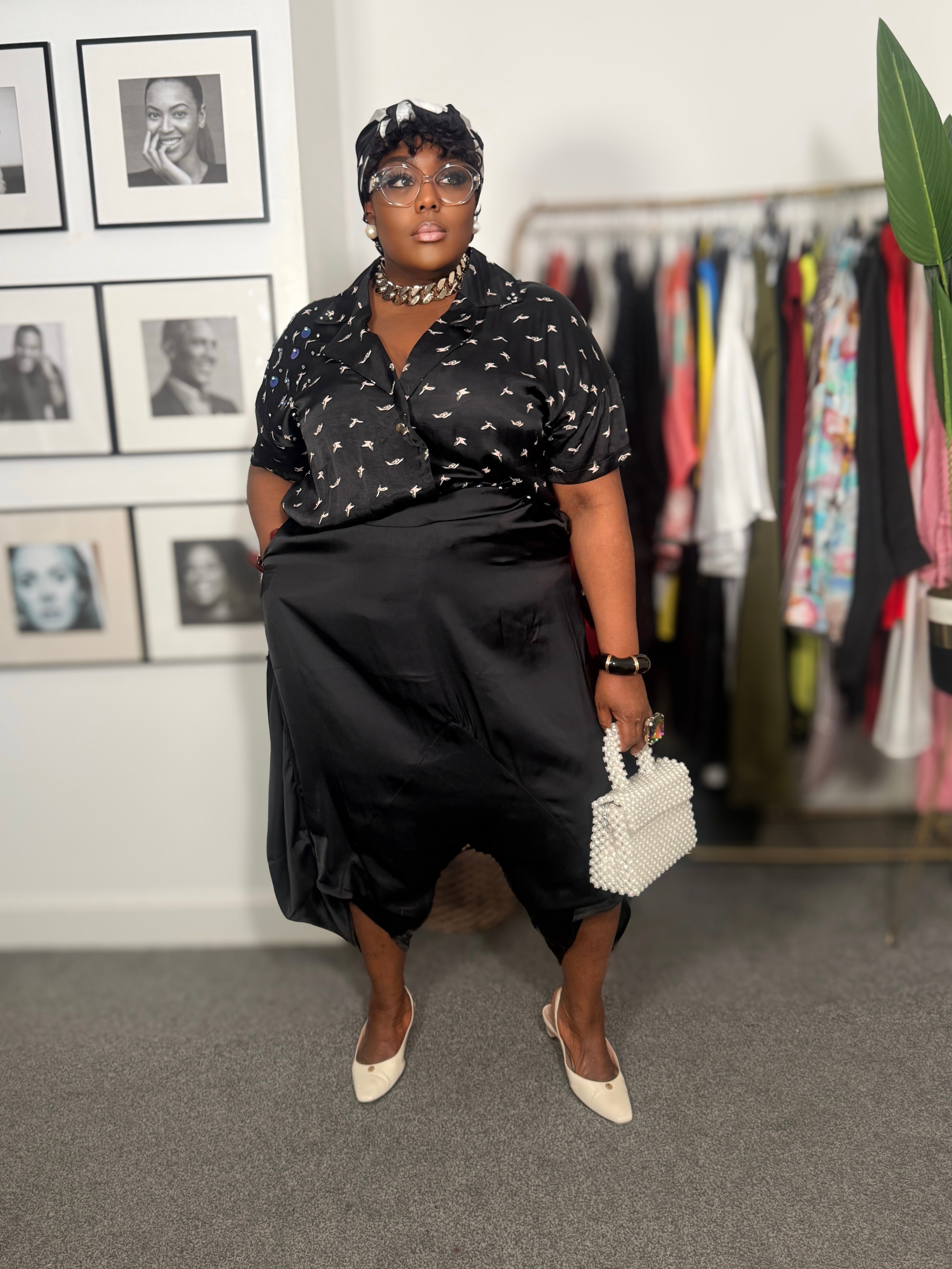 Crafted from a lightweight, fluid fabric, this trouser drapes effortlessly over the body, creating a sculptural silhouette that flatters without clinging. The relaxed harem cut offers comfort and freedom, while the softly dropped crotch and tapered hem bring modern edge and intentional design.