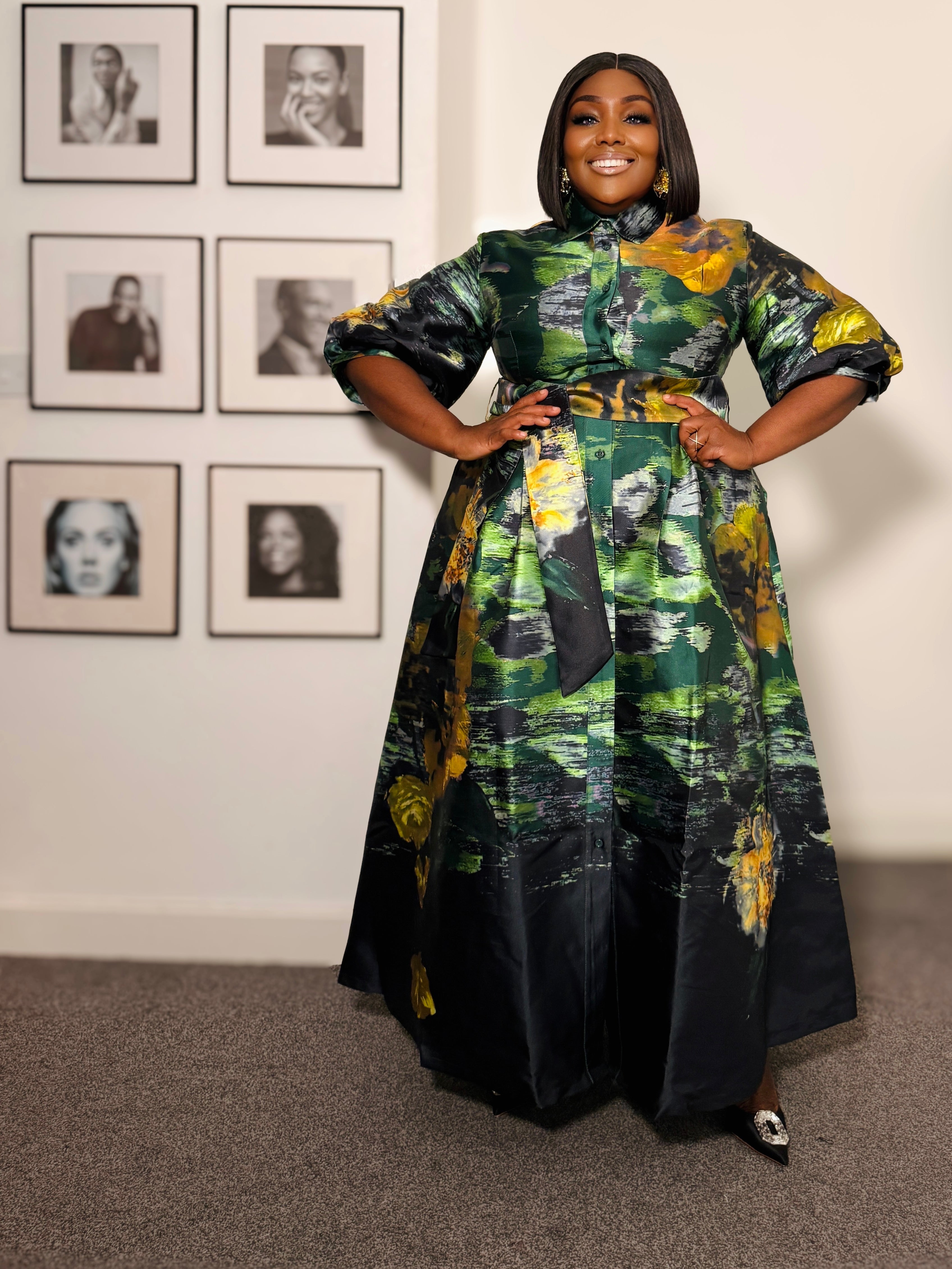 Command attention in TheThai Garden Dress — a masterpiece of elegance and empowerment. Crafted from luxurious shine with a painterly floral print reminiscent of impressionist art, this statement piece celebrates the beauty of bold femininity. The structured silhouette features voluminous puff sleeves, a tailored button-up bodice, and a sweeping full skirt that moves with effortless grace. The detachable waist belt cinches your figure beautifully, creating a sculpted, confidence-boosting shape that flatters every curve.