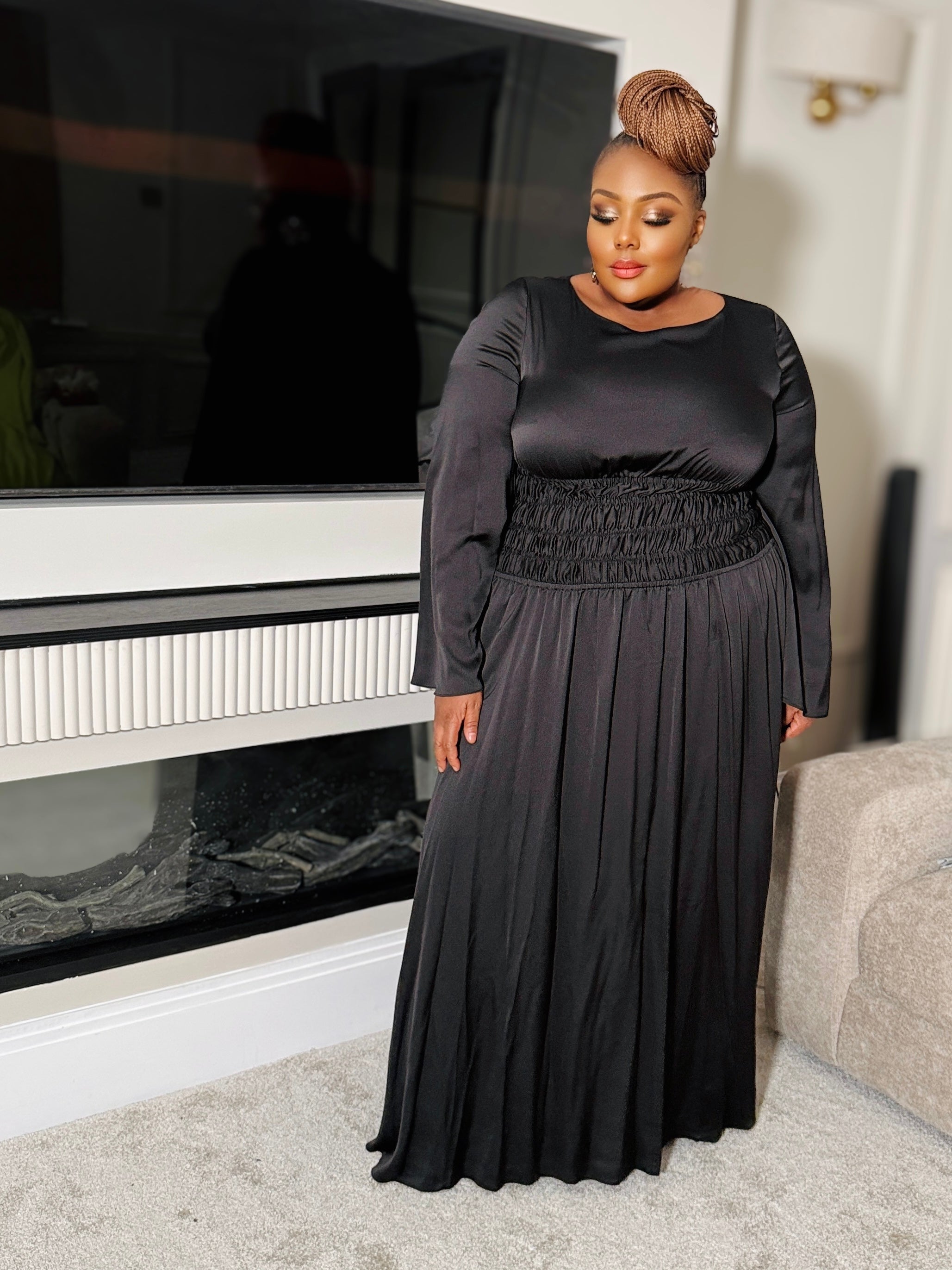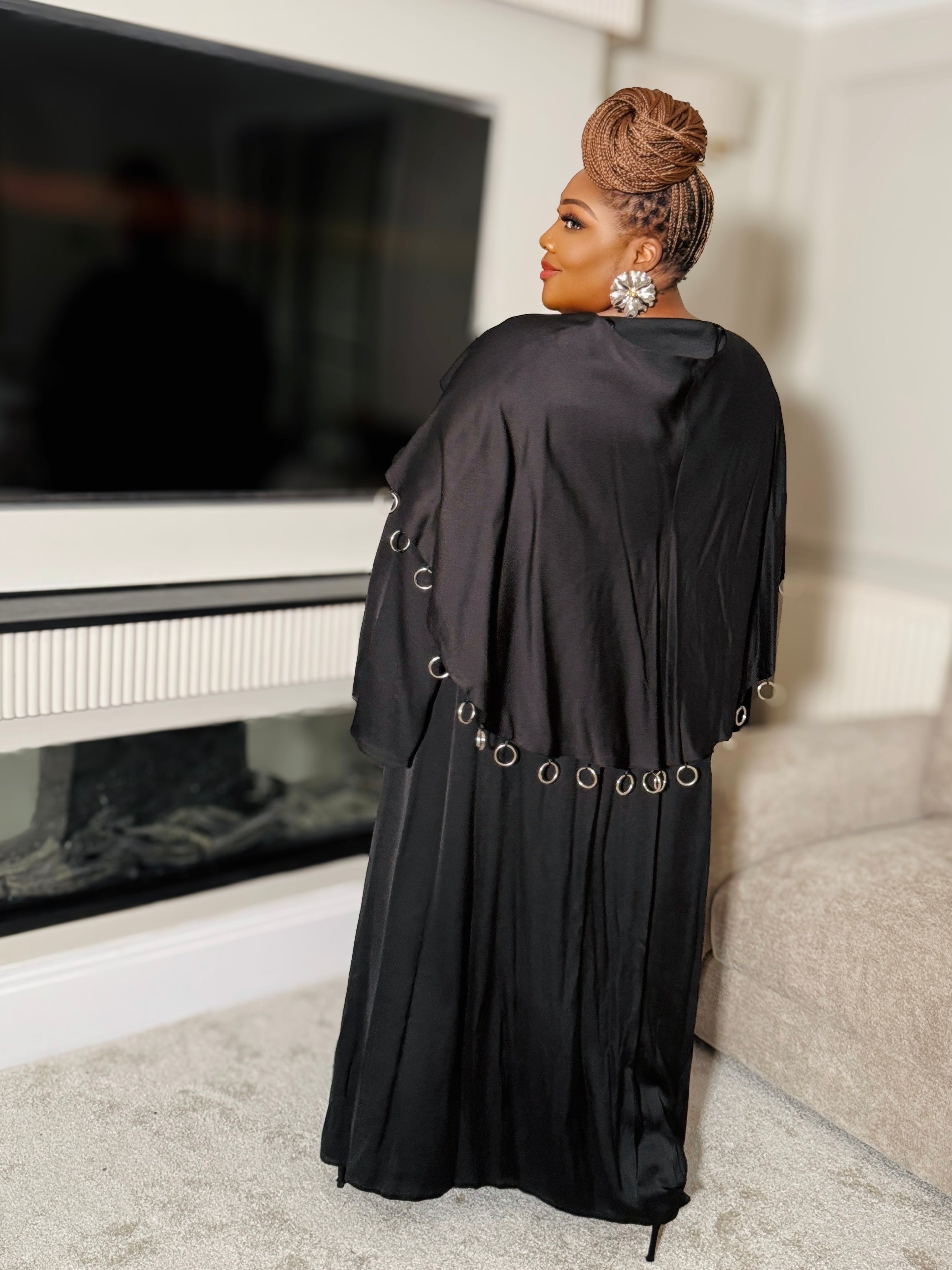 A perfectly structured smocked waistband cinches and defines your shape, offering comfort and contouring in one effortless fit. The detachable cape drapes gracefully across the shoulders, adorned with bold silver ring accents that add movement, personality, and a touch of modern edge.