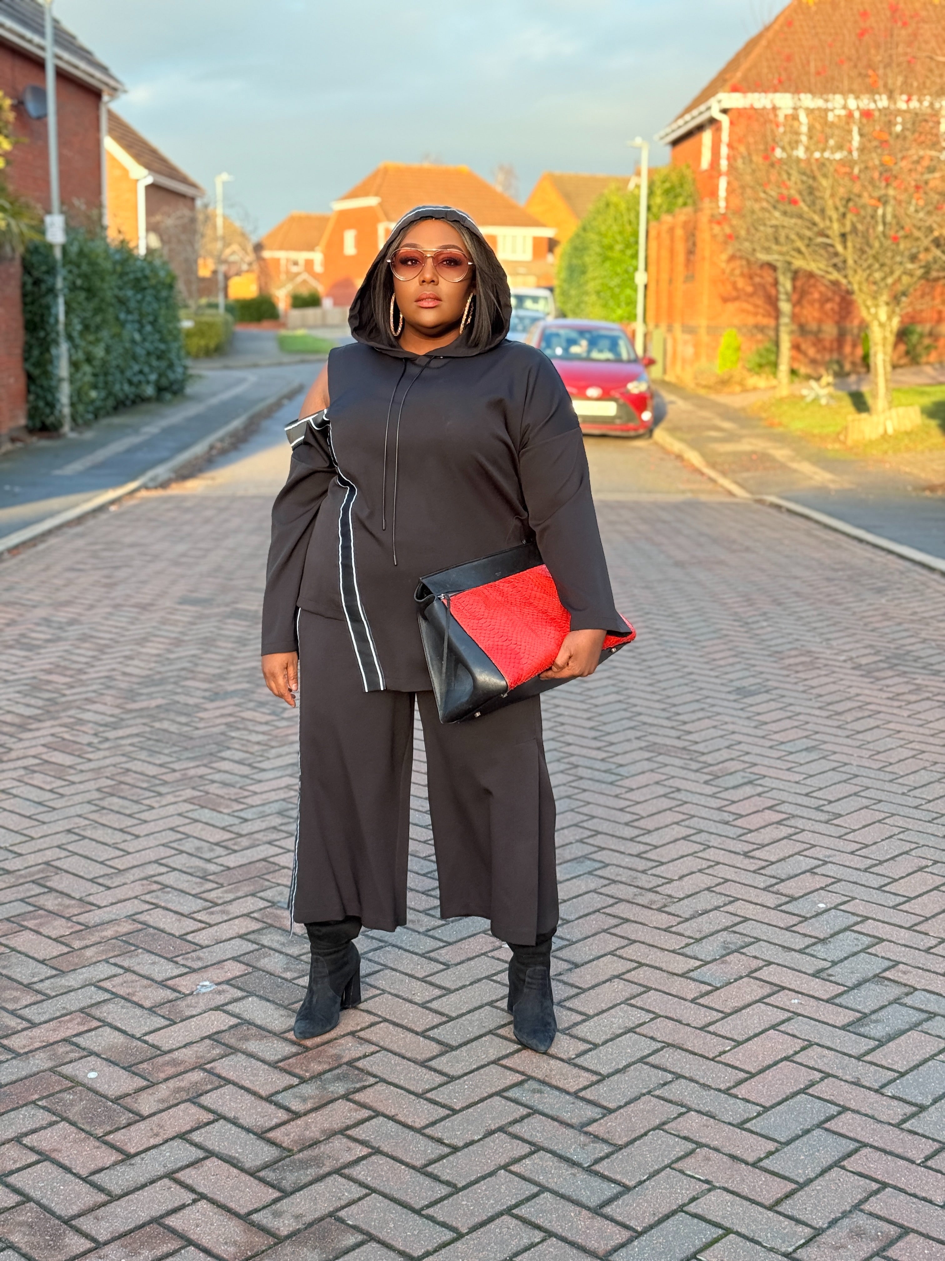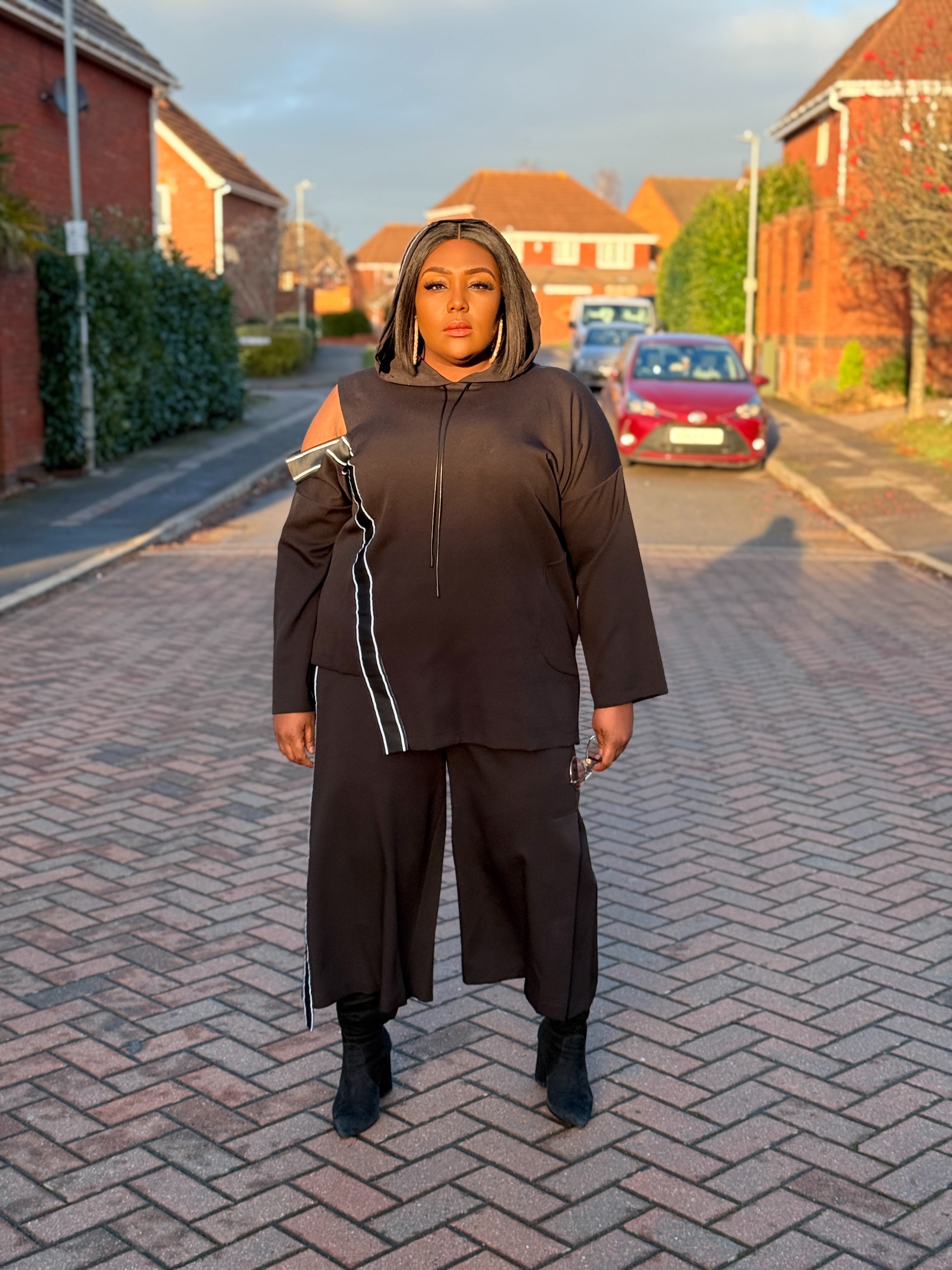 The asymmetric cold-shoulder hoodie top features sleek contrast piping that sculpts the body and draws the eye vertically—elongating your frame while celebrating your curves. Paired with wide-leg cropped trousers finished with matching stripe detailing, this set delivers balance, drama, and everyday wearability.