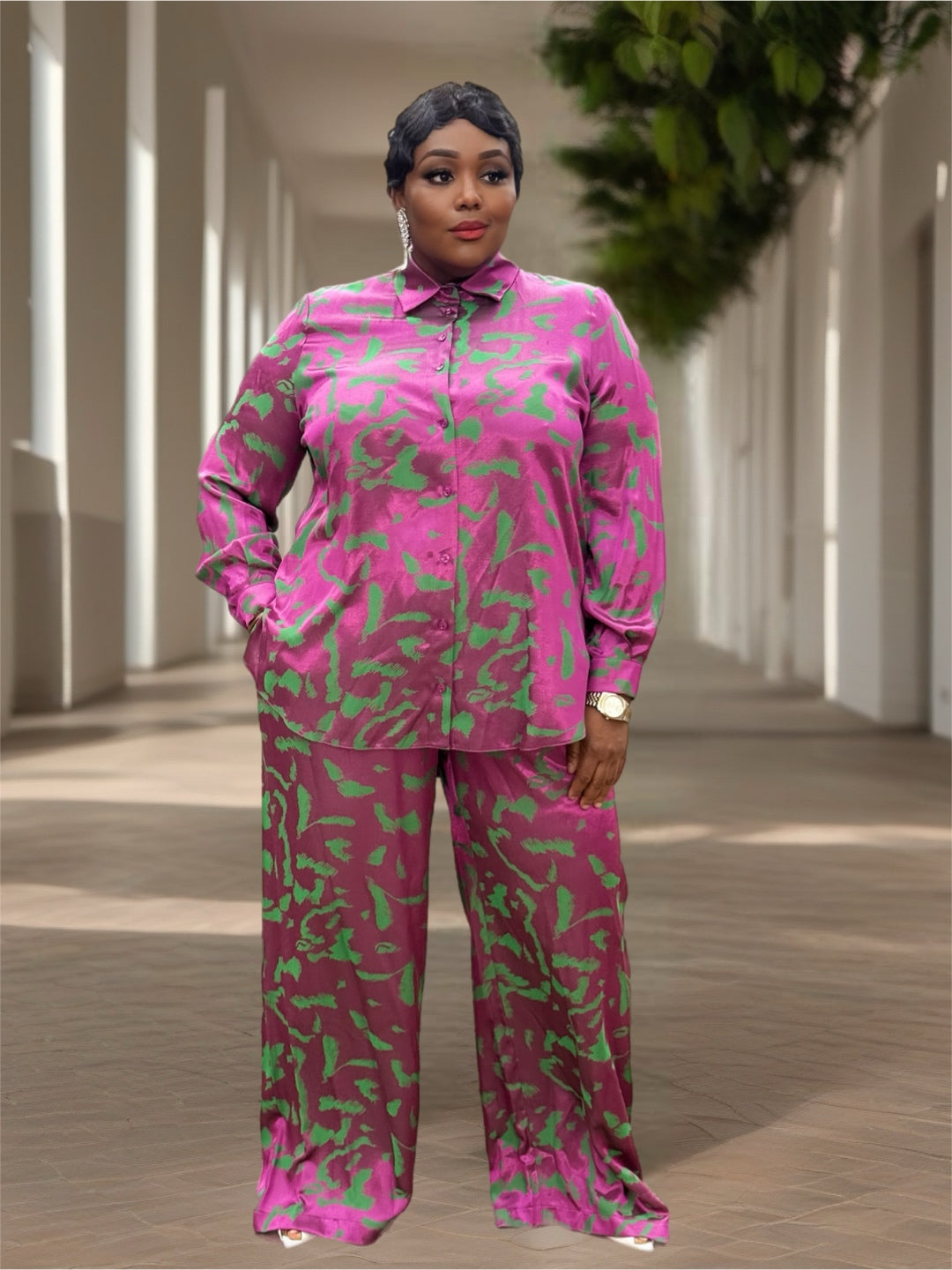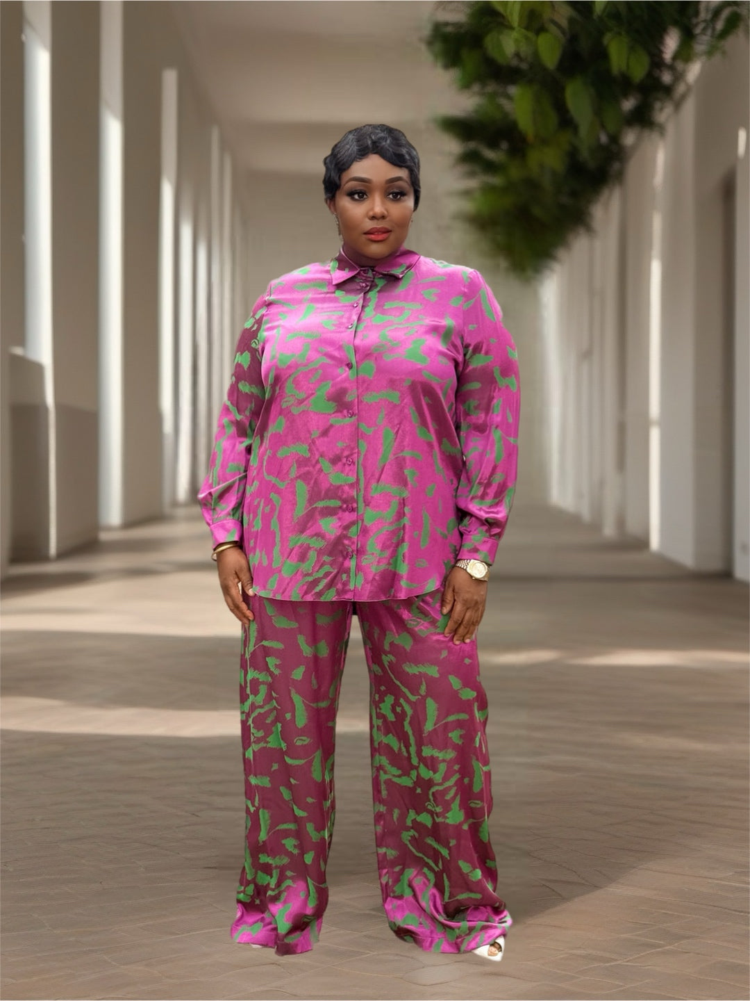 Turn heads in the Vogue Vista Co-Ord Set, a statement outfit designed for the confident, fashion-forward woman. This luxury co-ord features a bold fuchsia and green abstract print that embodies elegance, power, and individuality. The button-down satin shirt offers a relaxed yet refined fit, while the wide-leg trousers flatter every curve with graceful movement. Perfect for plus-size women who love vibrant, eye-catching styles that make them feel beautiful and empowered.